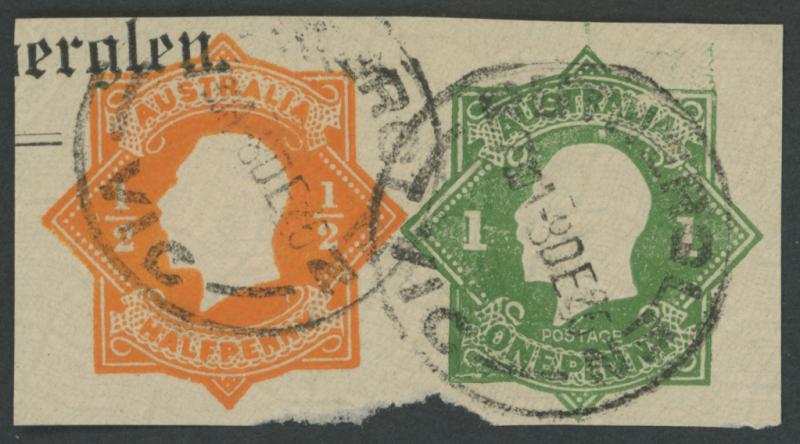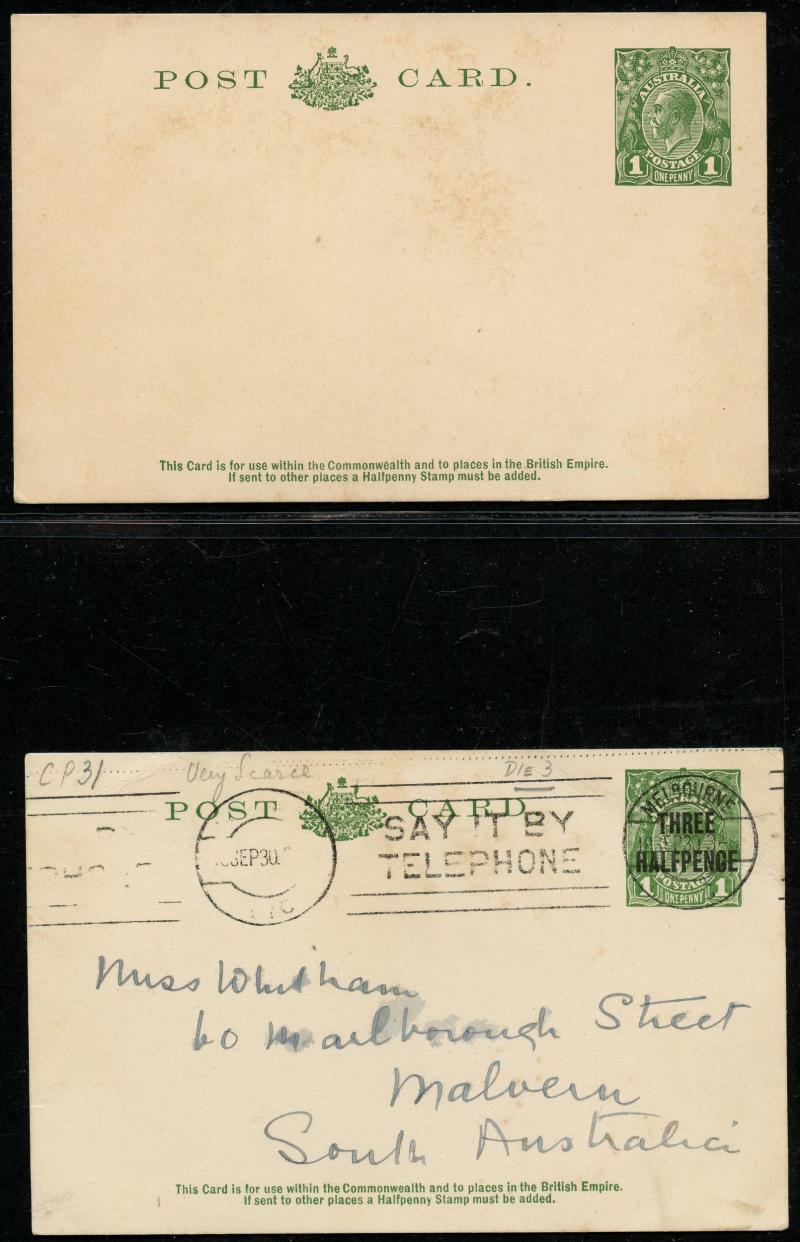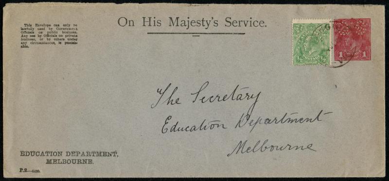 the rare KGV Star 'POSTAGE' 1d green + No 'POSTAGE' ½d orange 'doubleton' for the Shire of Rutherglen (Cat $3500 for an entire envelope), condition variable.