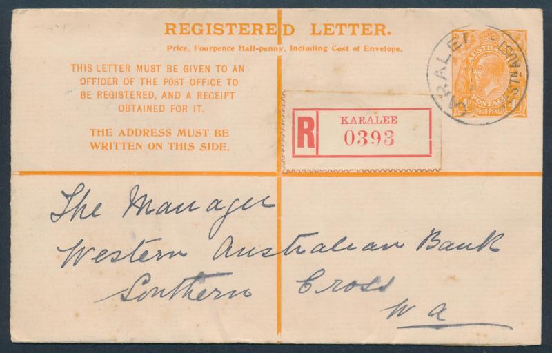 commercially used, 'THREE/HALFPENCE' on 2d scarlet Letter Card 'CARTING...' (bends, unused), KGV 4d orange/white Registration Envelope with 'KARALEE/WESTN AUST' cds & red/white R label, plus hundreds of cutouts including a few with 'OS'-in-the-die &