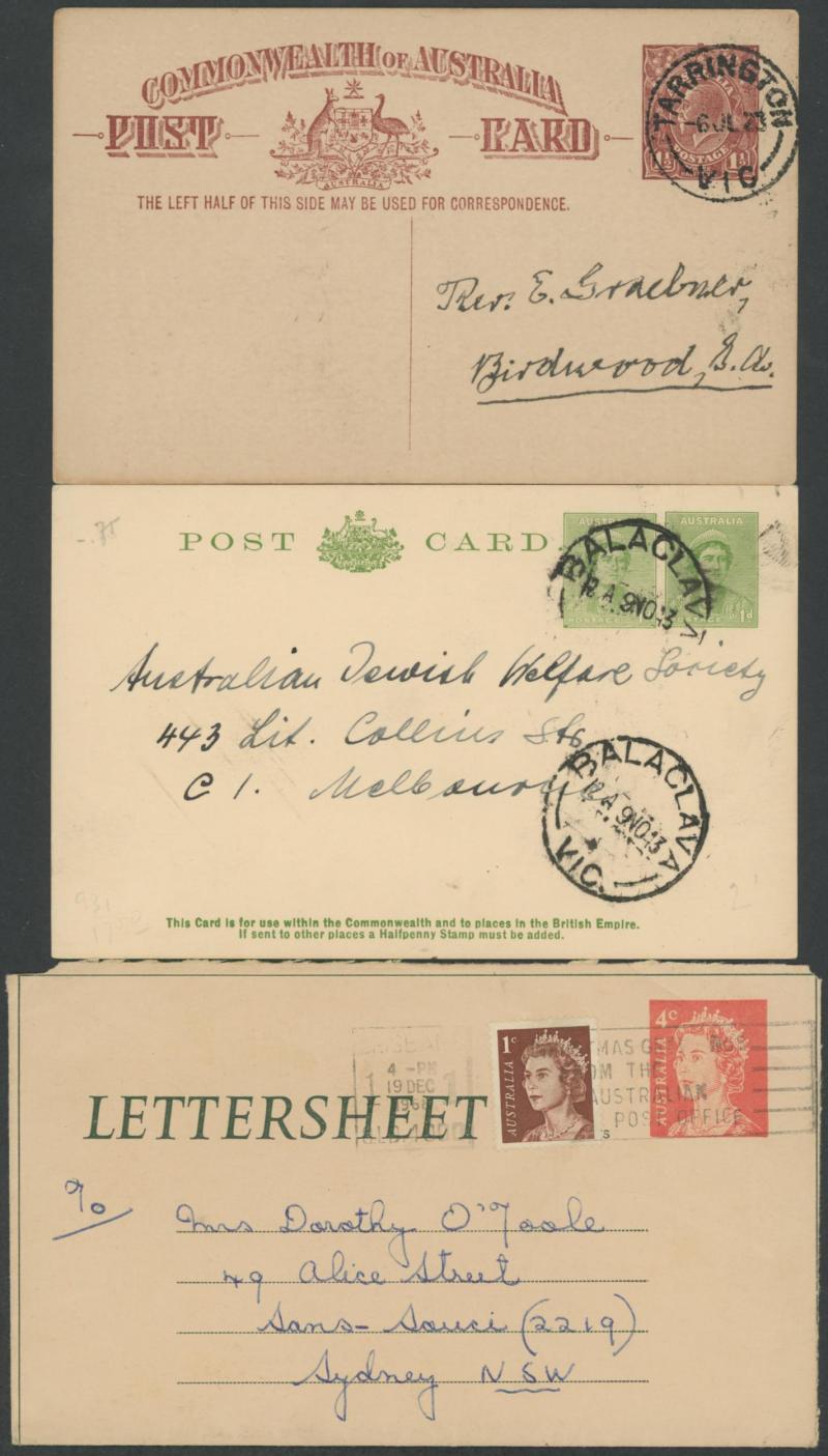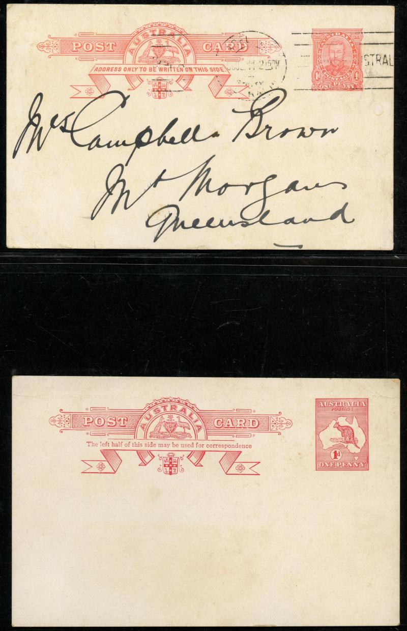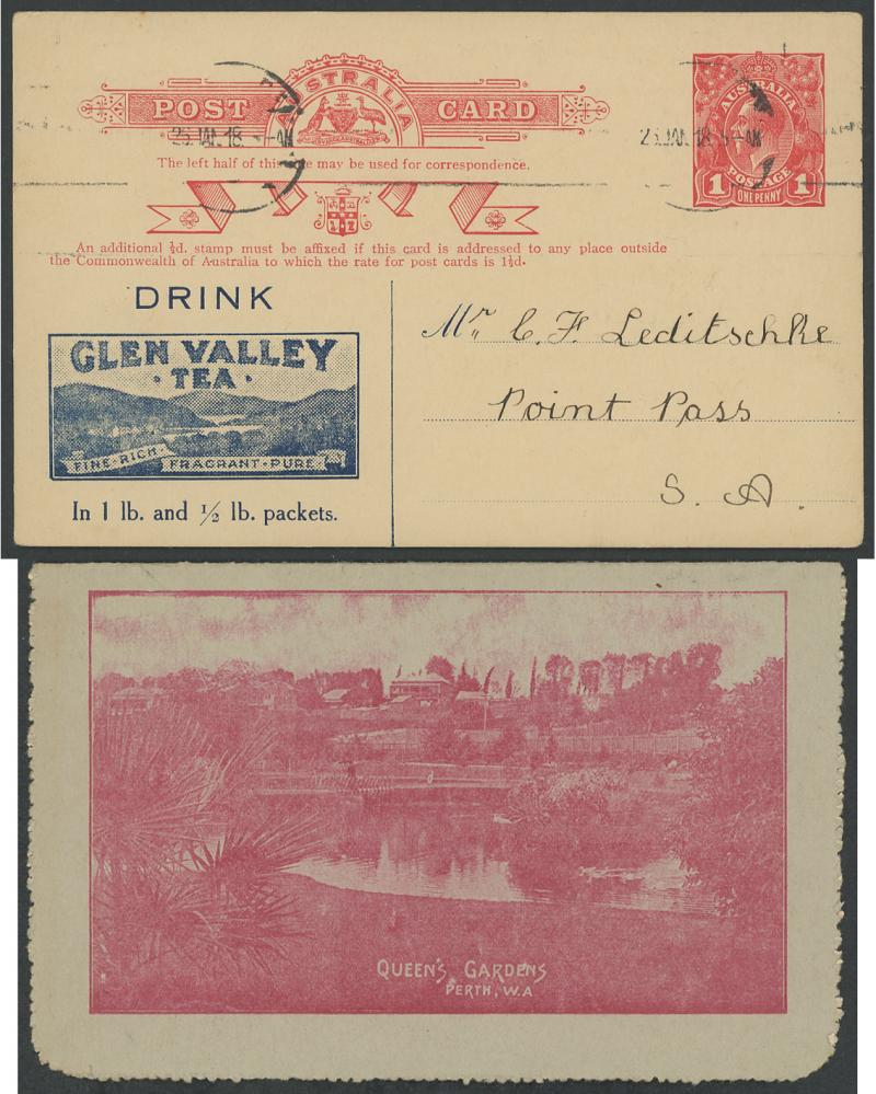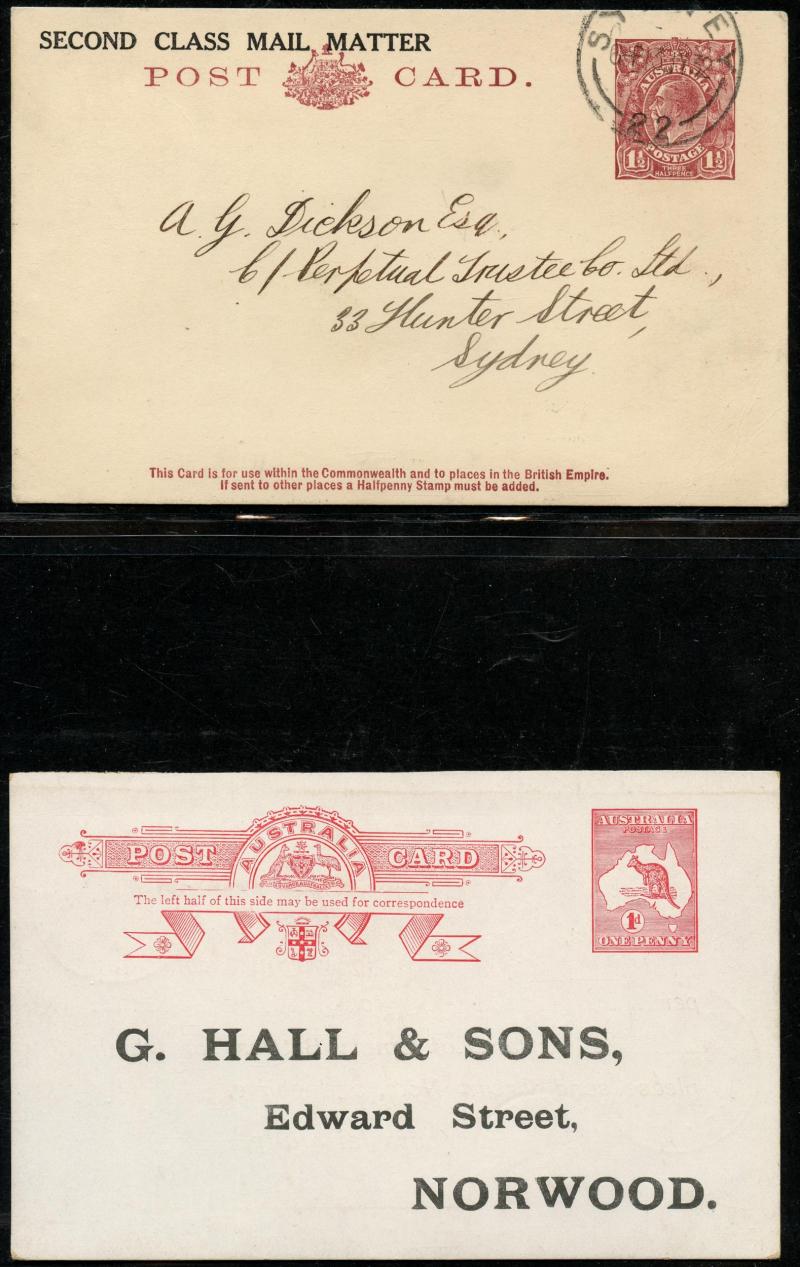 handstamps, Lettercards Kangaroo 1d magenta with oblong 'QUEEN'S GARDENS', Postal Cards 1911 Coronation x5 unused, KGV 1d red with illustrated advertising in blue for 'Glen Valley Tea' , KGV 1d green 'OS'-in-Die plus overprinted 'THREE/HALFPENCE'
