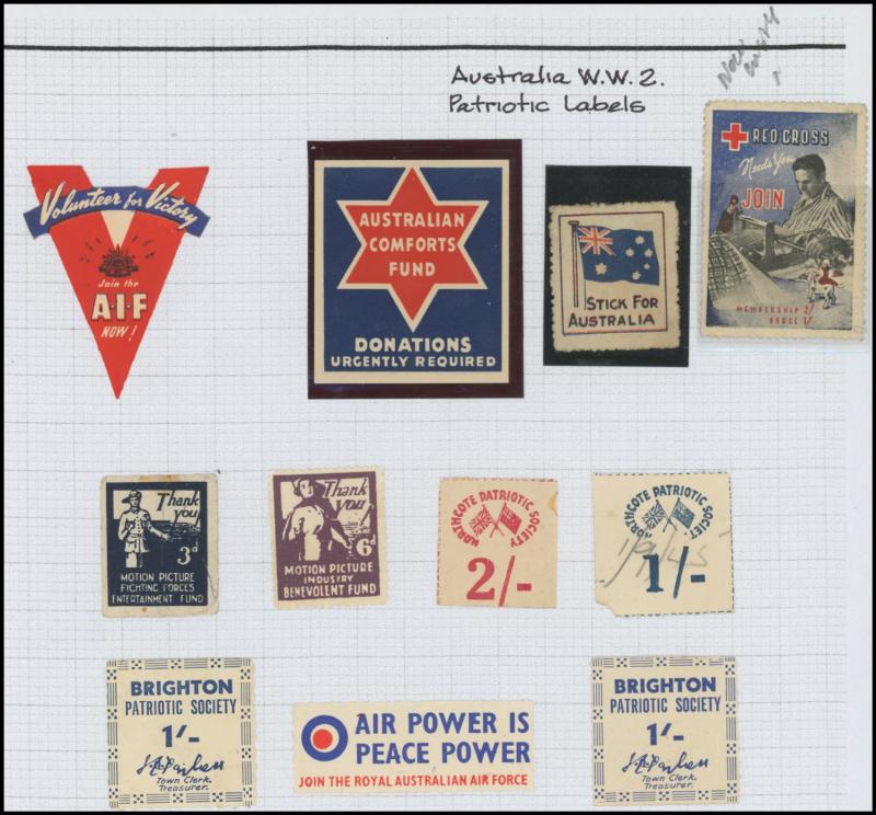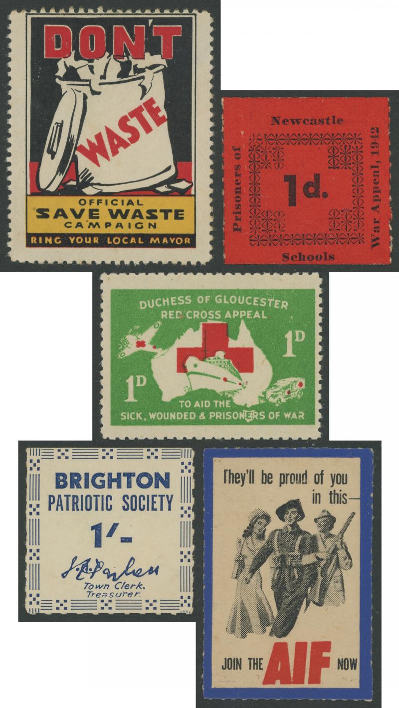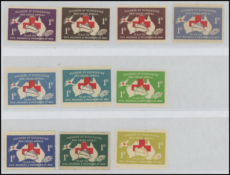 1d x19 including irregular block of 6 & a single in the very scarce booklet, Duchess of Gloucester/Red Cross x12 in various colours (one on the back of a philatelic cover), and various patriotic labels x13, generally fine to very fine.