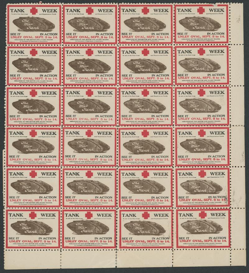 World War I 1918 Moor & Allied Trades 'TANK [red cross] WEEK/..../UNLEY OVAL...' (SAust) corner block of 24 (4x6) from the