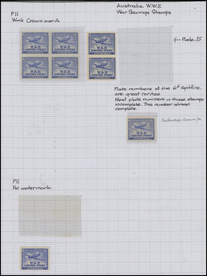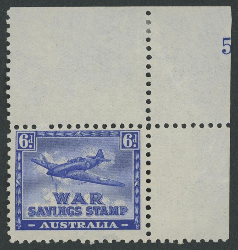 World War II War Savings Stamps 6d Aeroplane with Crown/A Wmk Perf 11 corner single from the upper-right of the sheet with full