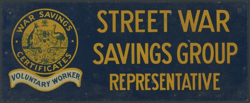 World War II War Savings Stamps yellow/blue metal sign with Commonwealth coat-of-arms at upper-left & inscribed 'STREET WAR/SAVINGS