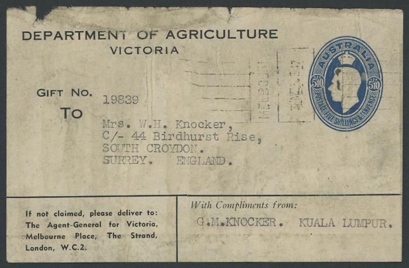 roller, light soiling & a couple of minor peripheral faults, Cat $1500. Unusually, the sender was "GM Knocker Kuala Lumpur". Similar agent mailings of Myer labels from Singapore & India are known; this is the first we have seen of an Agriculture