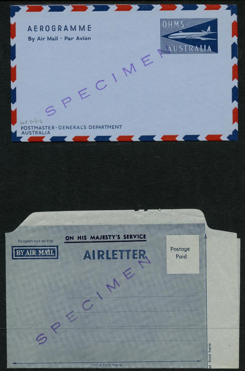 Selection with many better items predominantly used including Aerogrammes OHMS 'Postage/Paid' & Plane both with 'SPECIMEN'