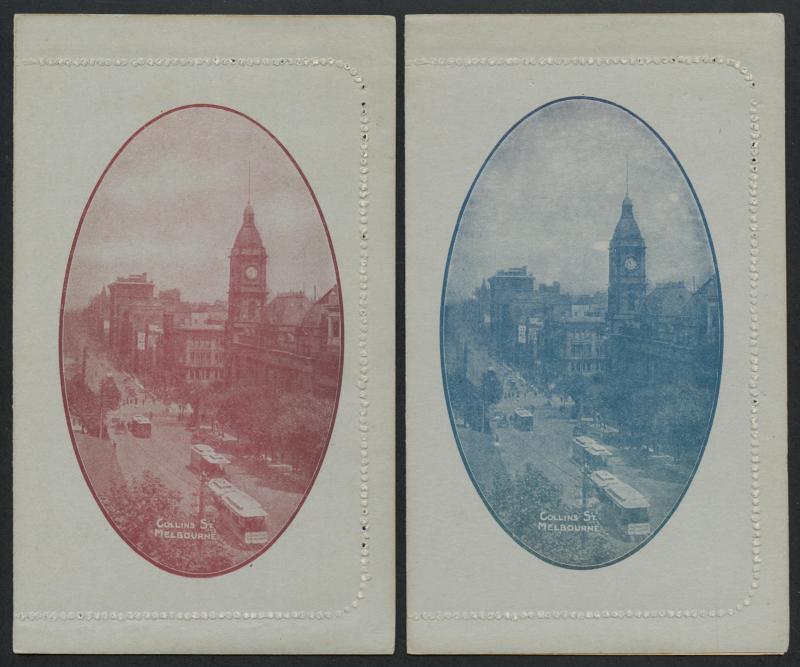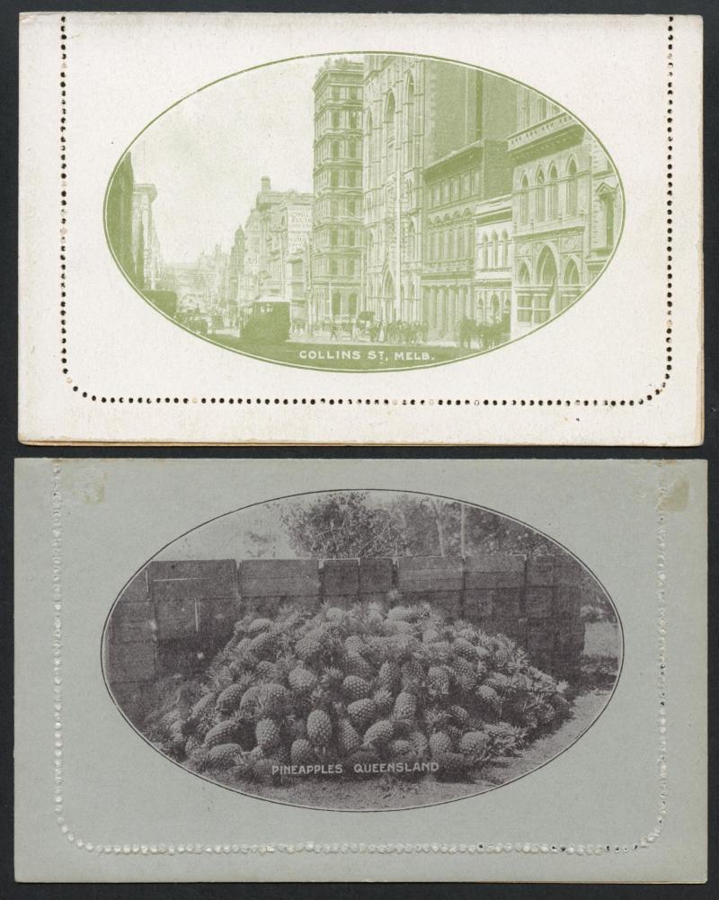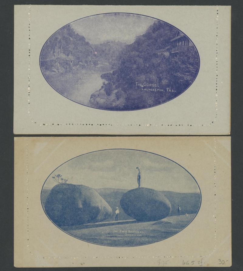 (oblong), 'CATARACT GORGE' (part-oval), 'HARVESTING TAMWORTH', 'NATIONAL PARK/NS WALES' (vertical, with boat x3 different, including oblong), 'ON THE MURRAY, 'QUEEN'S GARDENS' (oblong), 'ST GEORGE'S TERRACE PERTH' (part-oval & oblong), 'THE TWO