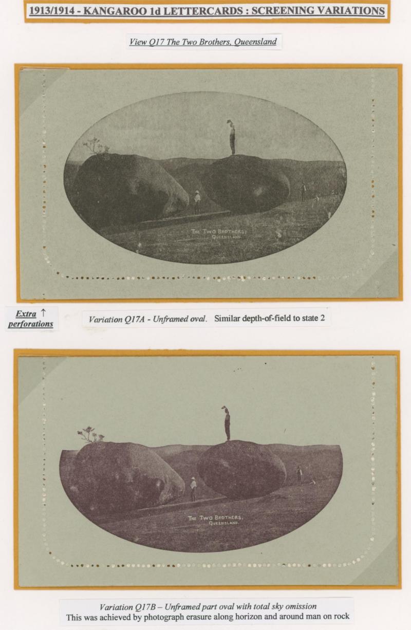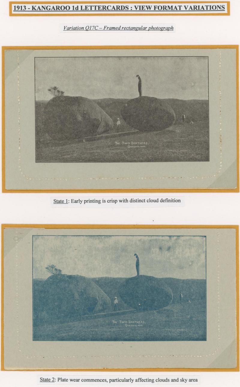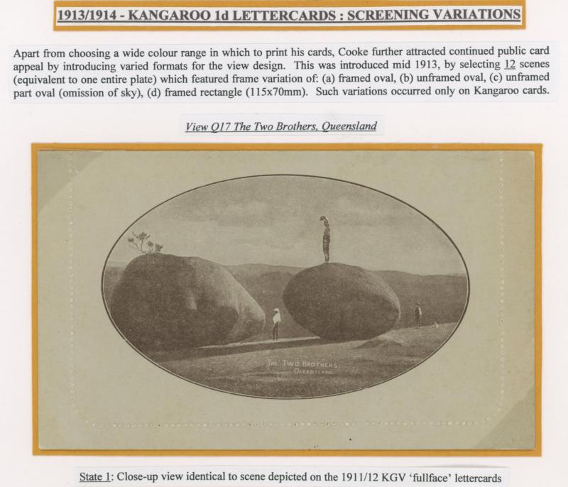 LETTER CARDS: 1913 Kangaroo 1d 'THE TWO BROTHERS/QUEENSLAND' deterioration of the plate comprising Framed Oval x2 different depth