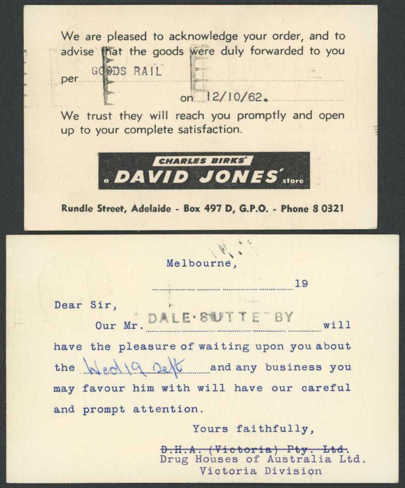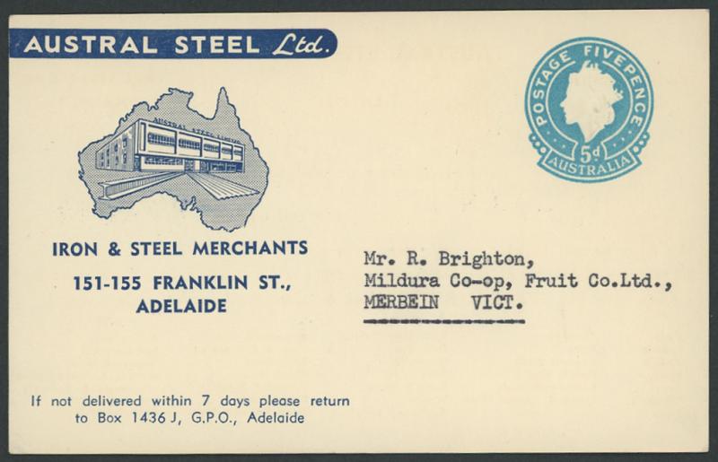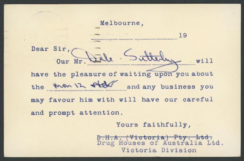 POSTAL CARDS - STAMPED TO ORDER: 1960 QEII 5d indigo ACSC PS35 plain card with advice on the reverse for Drug Houses of Australia,