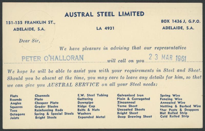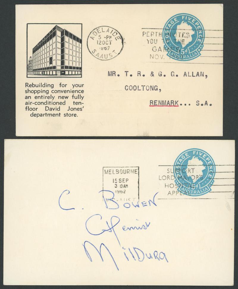Australia, used at Melbourne in 1962, and illustrated types for David Jones Adelaide (different from that illustrated in the ACSC) used in 1962, and Austral Steel Adelaide - unrecorded user - used in 1961 but uncancelled (creased through the stamp),