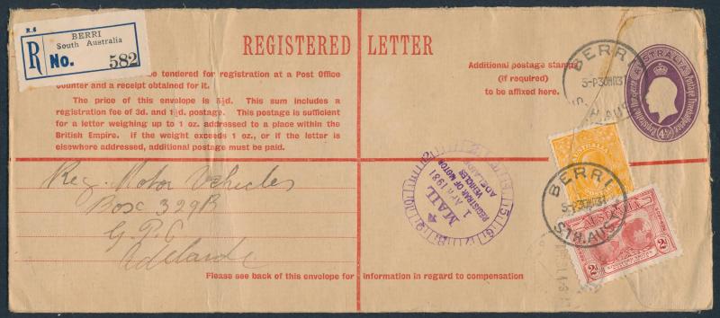 sizes, with Price Advice added at the Top used x2 (both defective), KGV 4d orange with Red Star & with Orange Star, 1919 New Design with Admonition at the Base RE9 (used at Hobart with red/white R label, Pictorial ½d & 1d unnecessarily added & not