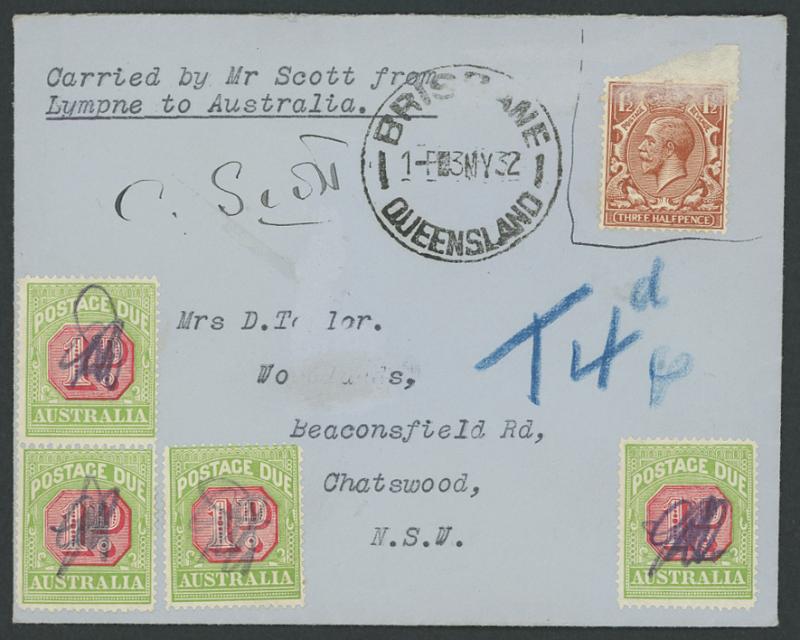 1932 England-Australia per CWA Scott AAMC 258 signed "C Scott", with GB 1½d not cancelled, Brisbane cds of 3MY32 where endorsed