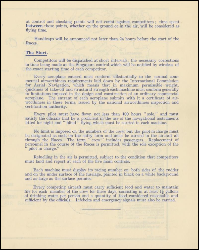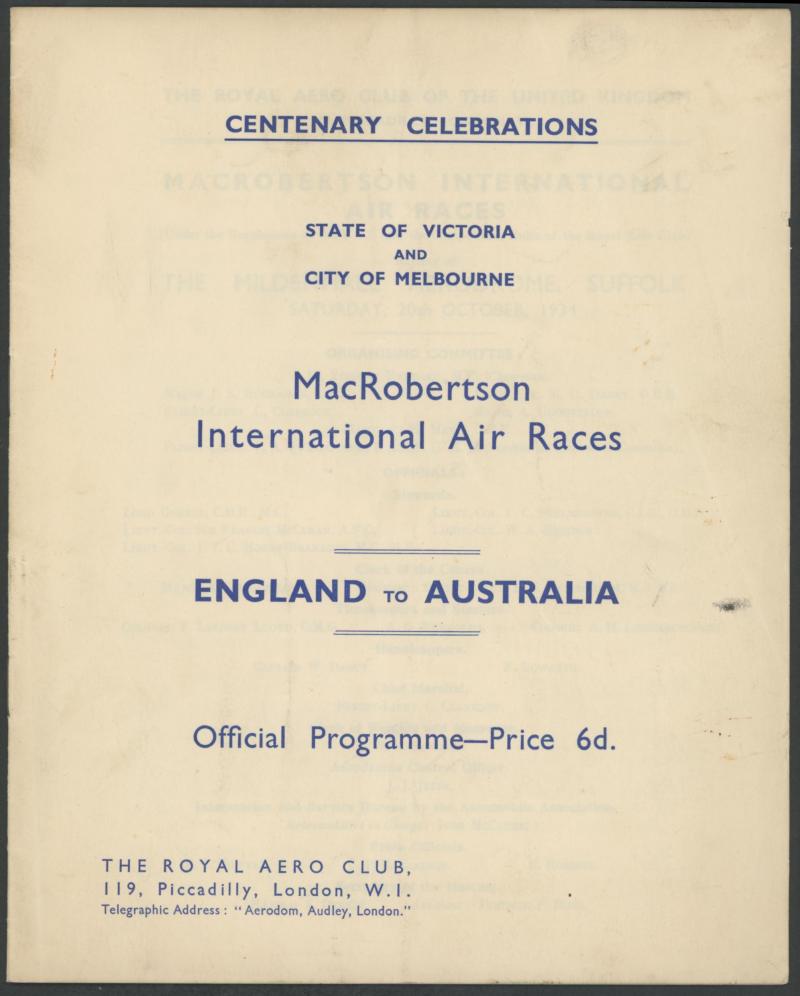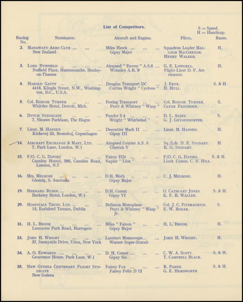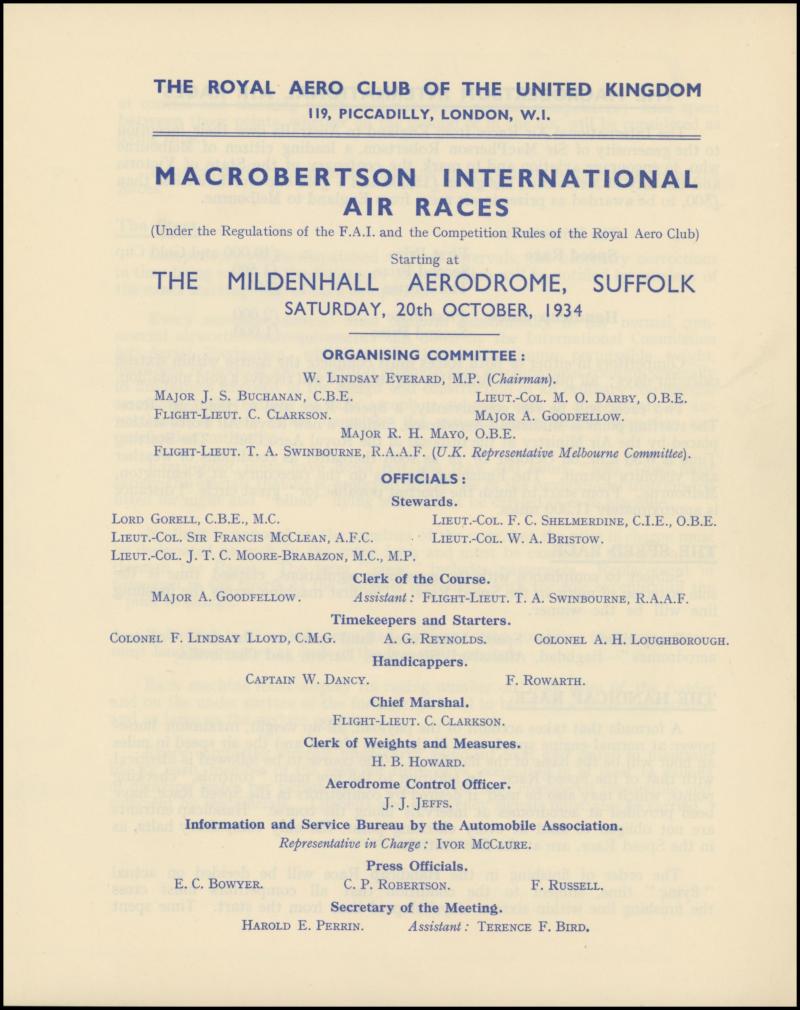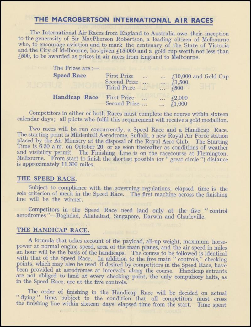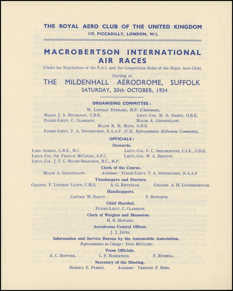 1934 MacRobertson Air Race Royal Aero Club (London) 12pp 'Official Programme' with the Rules, List of the 64 Entries, Map of the