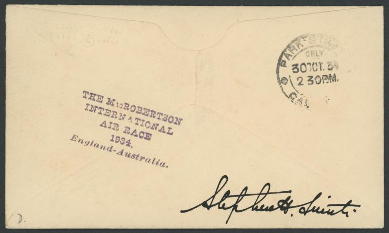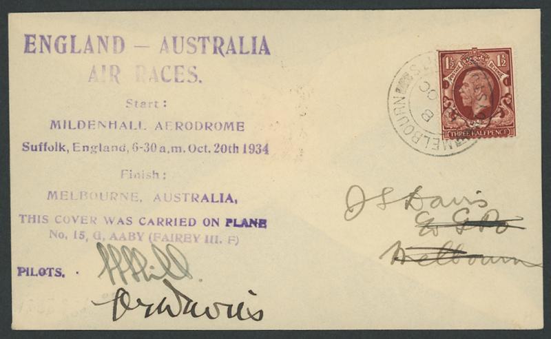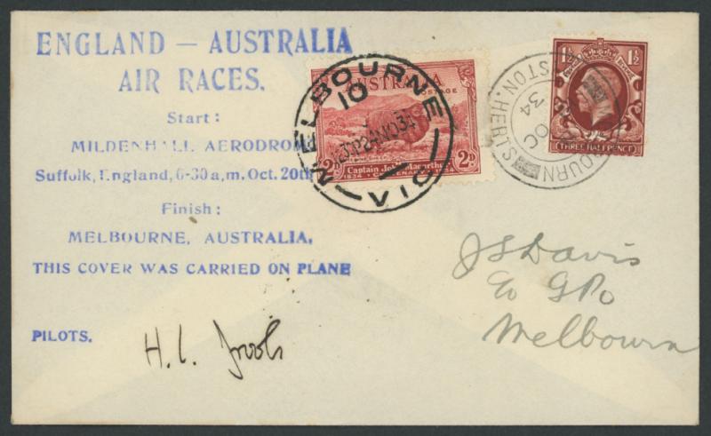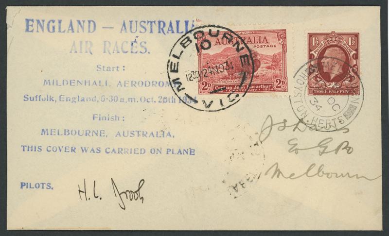 1934 MacRobertson Air Race cover with huge cachet in blue & signed "HL Brook" with GB 1½d tied by 'MELBOURN/ROYSTON HERTS' cds &
