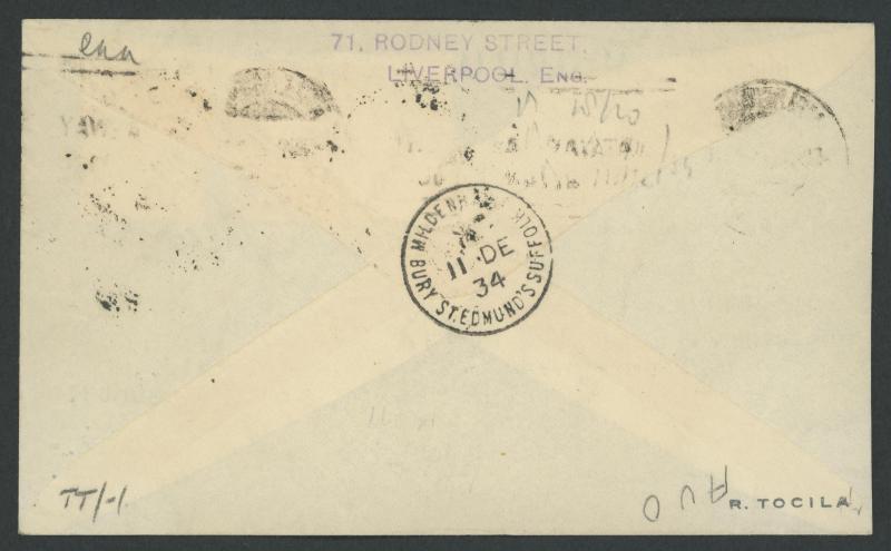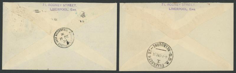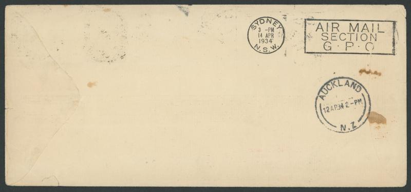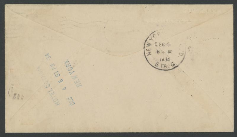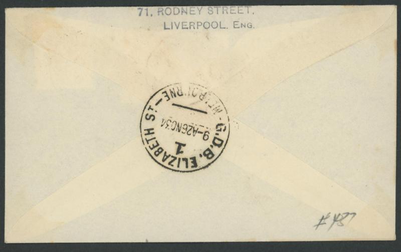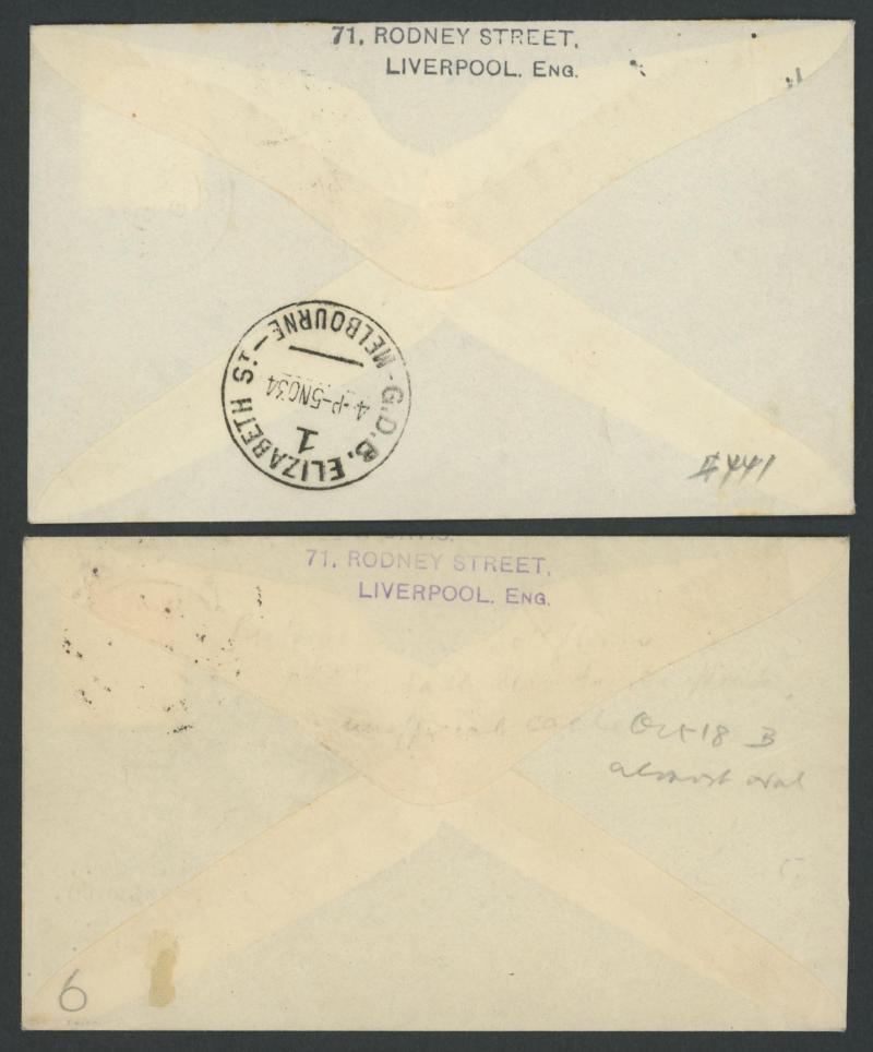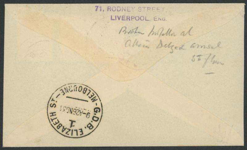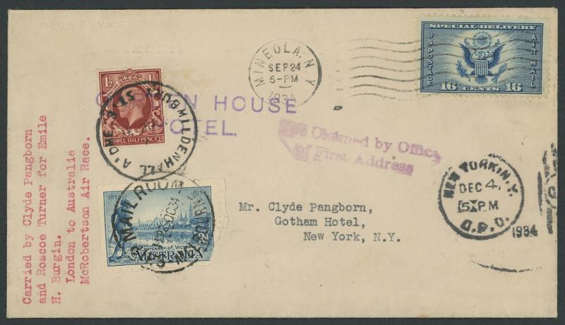 journey, GB 1½d tied by Mildenhall cds & Victoria Centenary 3d tied by Melbourne arrival cds, to "Clyde Pangborn/Gotham Hotel/New York" with New York datestamps of DEC4/1934 on both sides, AAMC 434a, Cat $450. The only such 'round-the-world' cover we