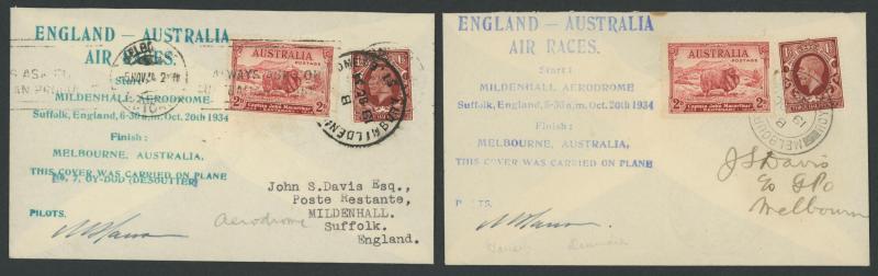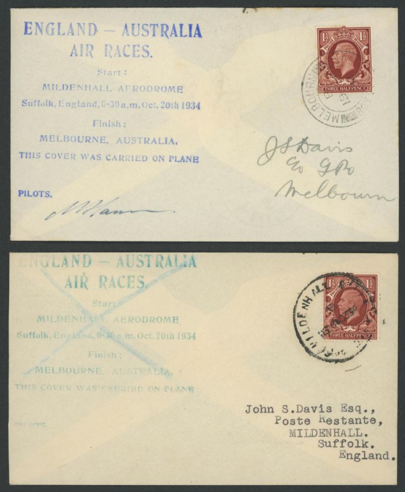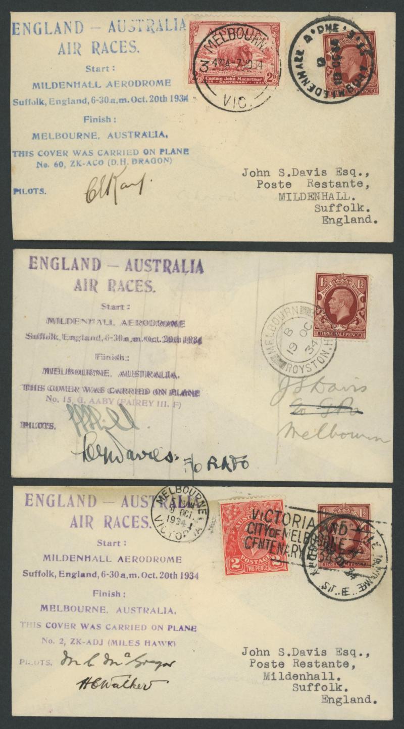 1934 MacRobertson Air Race JS Davis covers with huge Race cachet in blue x3 or violet x2 signed by pilots "HL Brook", "CE Kay", "CG