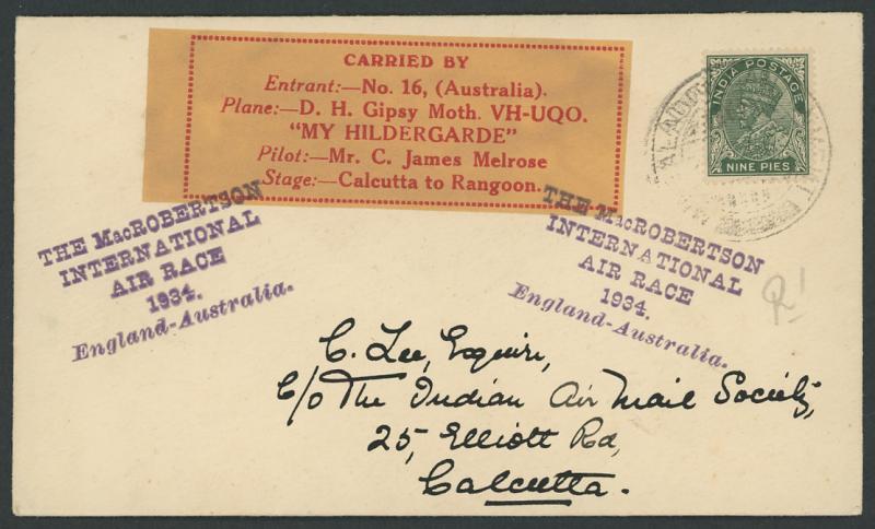 1934 MacRobertson Air Race Calcutta-Rangoon per Jimmy Melrose with red/yellow-buff label & Air Race cachet in purple AAMC 436a, Cat