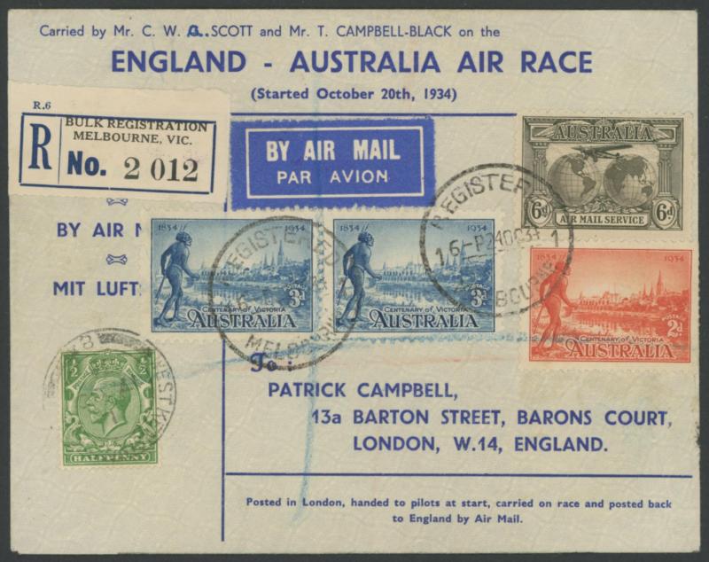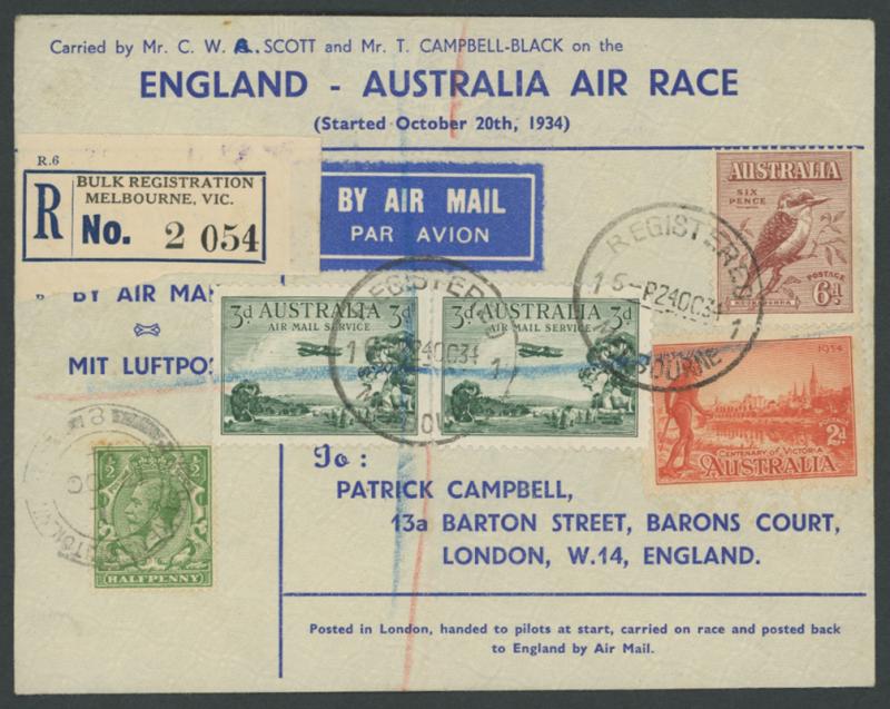 1934 MacRobertson Air Race printed 'boomerang' cover for Scott & Campbell-Black with GB ½d tied by 'WEST KENTISH...' cds & 1/2d in
