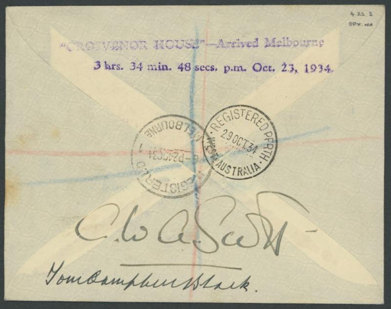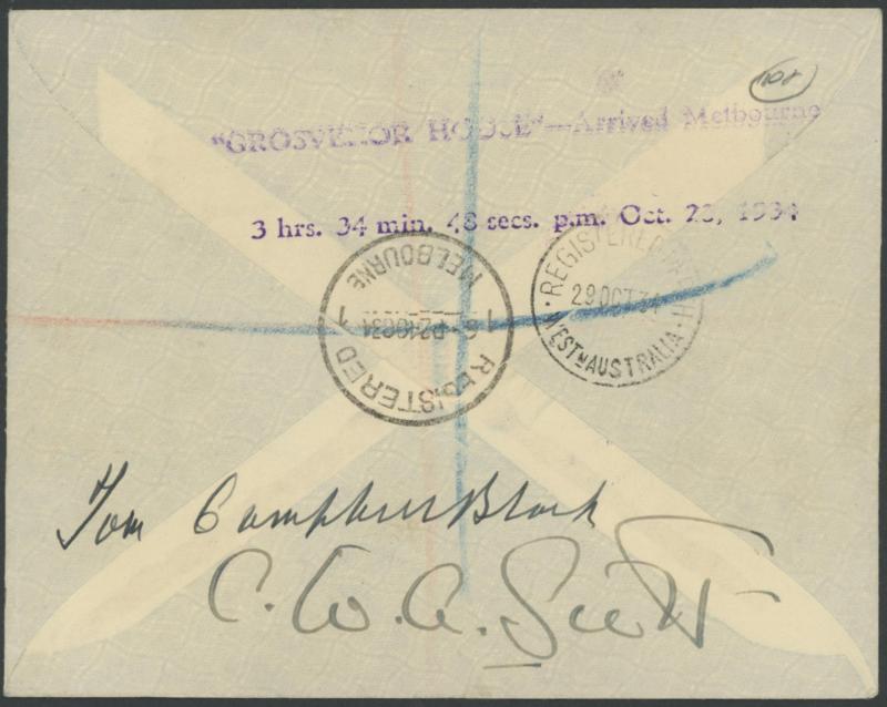 Australian stamps cancelled on arrival at Melbourne with blue & black/white R label, signed on the reverse by "Tom Campbell Black" & "CWA Scott" with 'GROSVENOR HOUSE - Arrived Melbourne/...' cachet in violet, AAMC 433, Cat $1250. Plus press