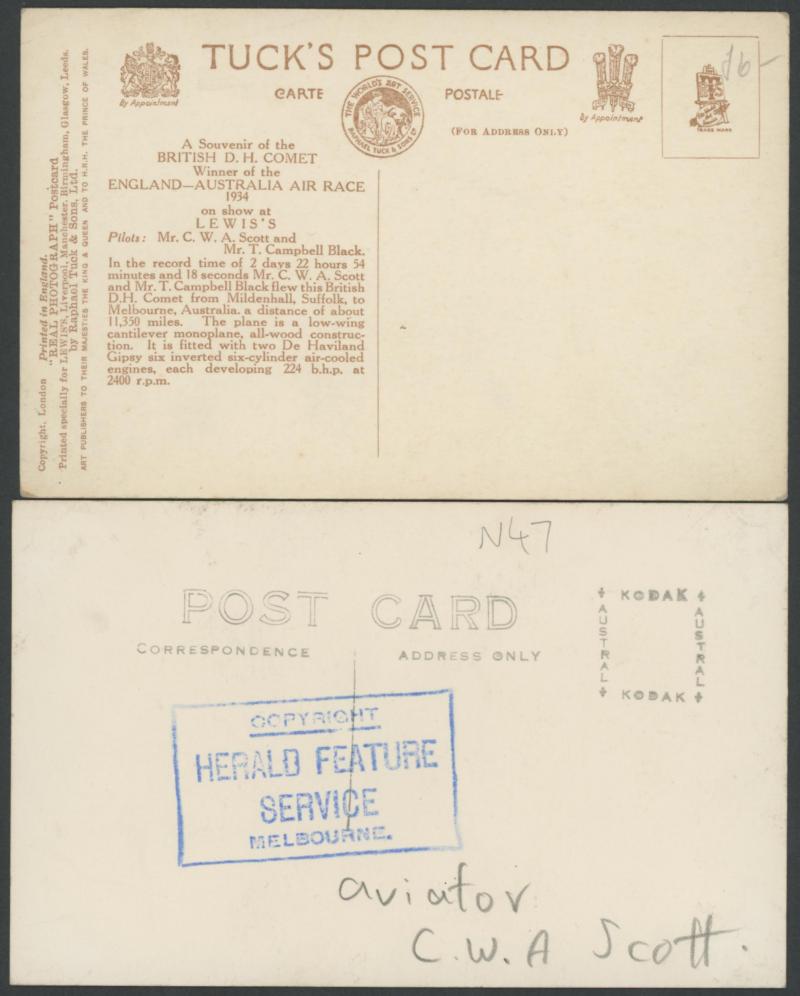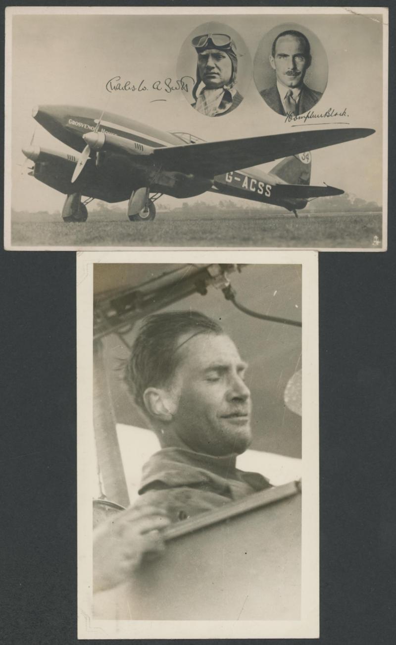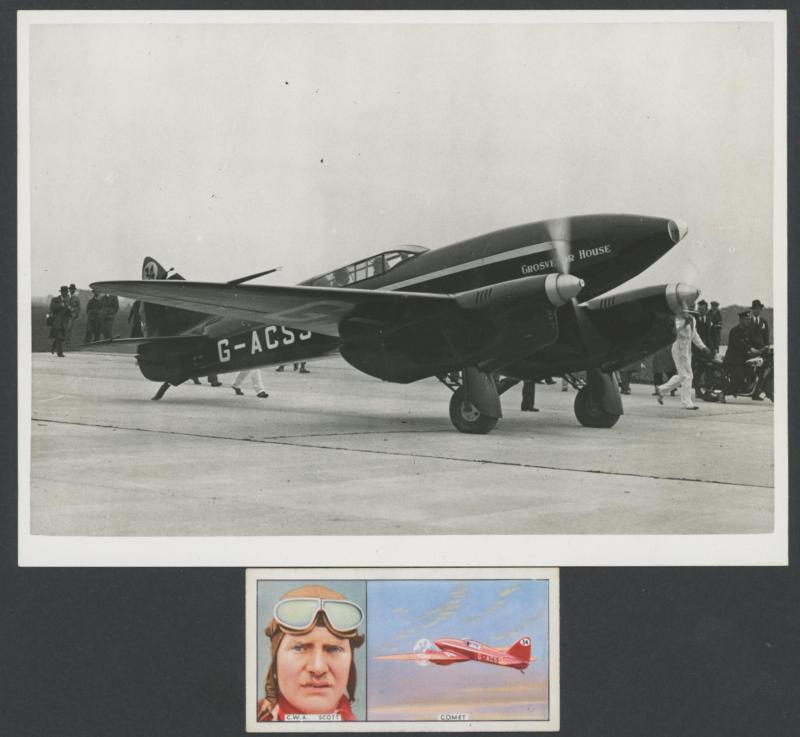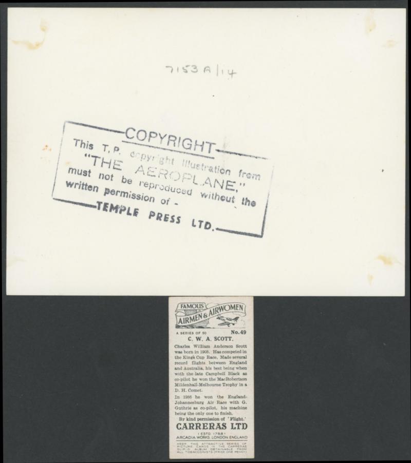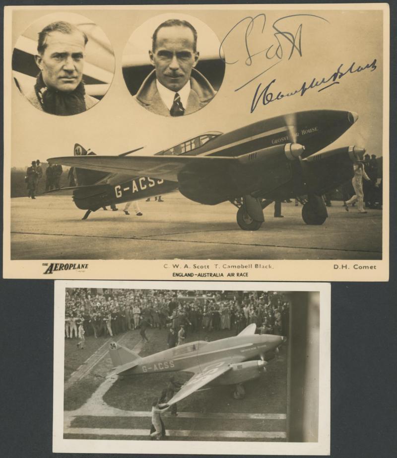 photographs of the plane (very fine), Scott alighting from the plane at Singapore (minor blemishes) and two of both men fronting the press on their return to England; superb cigarette cards of Scott & 'COMET' and of the two pilots; etc. An important