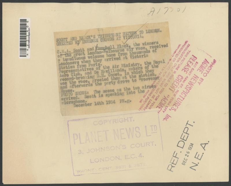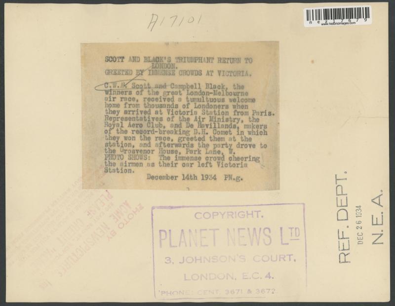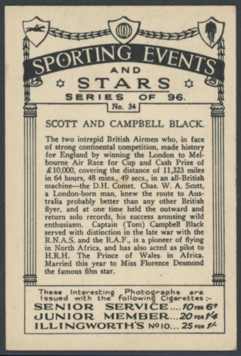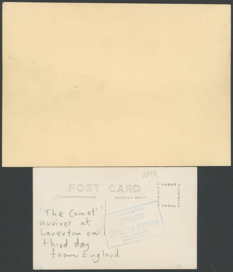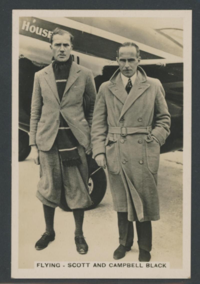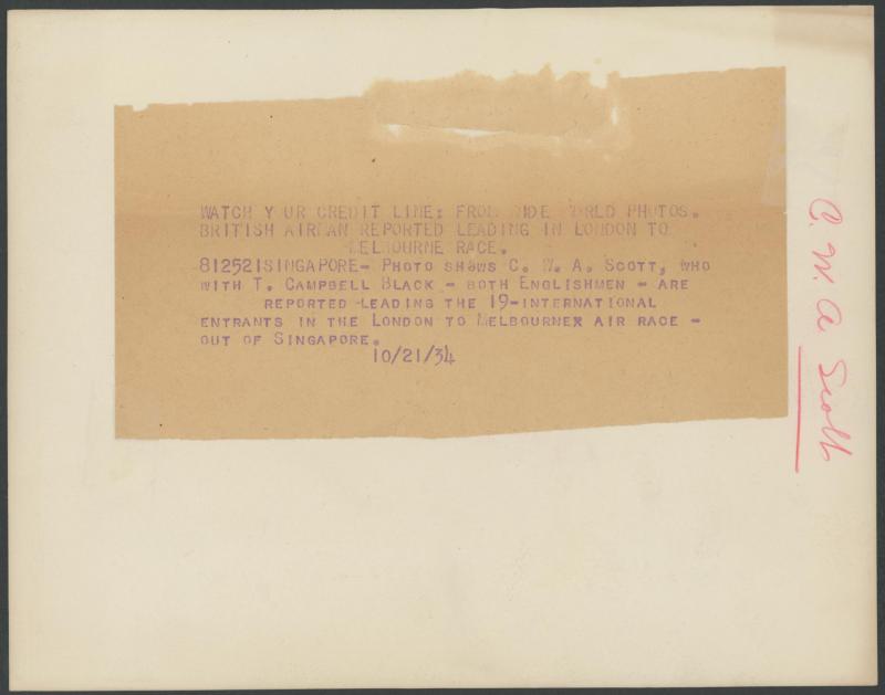 photographs of the plane (very fine), Scott alighting from the plane at Singapore (minor blemishes) and two of both men fronting the press on their return to England; superb cigarette cards of Scott & 'COMET' and of the two pilots; etc. An important