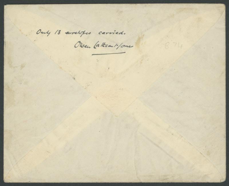 OFFICE/2NOV1934/LYMPNE AIR PORT' cachet at lower-left, Victoria Centenary 2d cancelled on arrival at Melbourne, signed "KWF Waller" and "Owen Cathcart Jones" who endorsed the flap "Only 13 examples carried", light spotting, AAMC 435, Cat $1600. (Image1) (Image2)