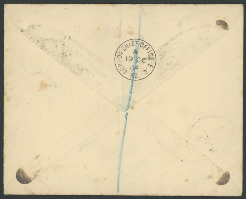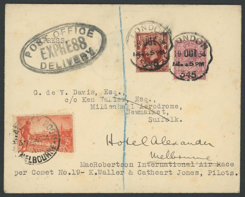 1934 MacRobertson Air Race plain cover with GB 1½d & KGV tied by deformed rubber 'LONDON/19OCT34/ 345 ' cds with double-oval 'POST