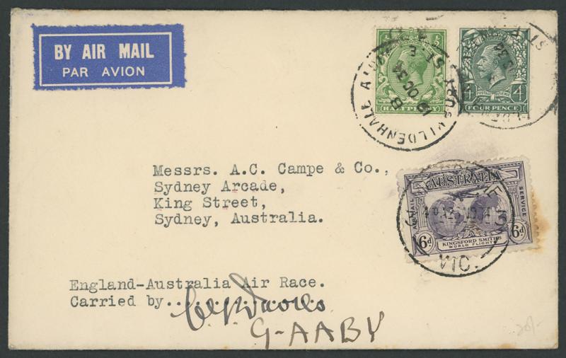 1934 MacRobertson Air Race plain cover to a Sydney dealer with GB ½d & 4d tied by Mildenhall cds & Kingsford Smith 6d tied by