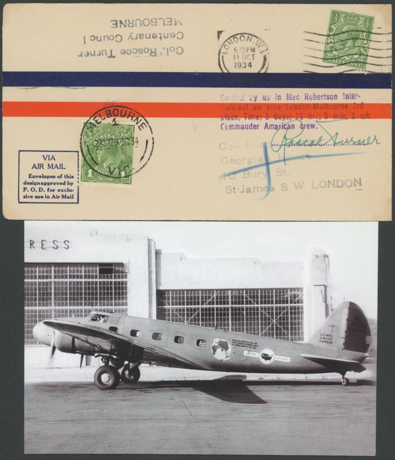 1934 MacRobertson Air Race American airmail envelope with GB 1½d tied by London machine & Australia KGV 1d green tied by Melbourne