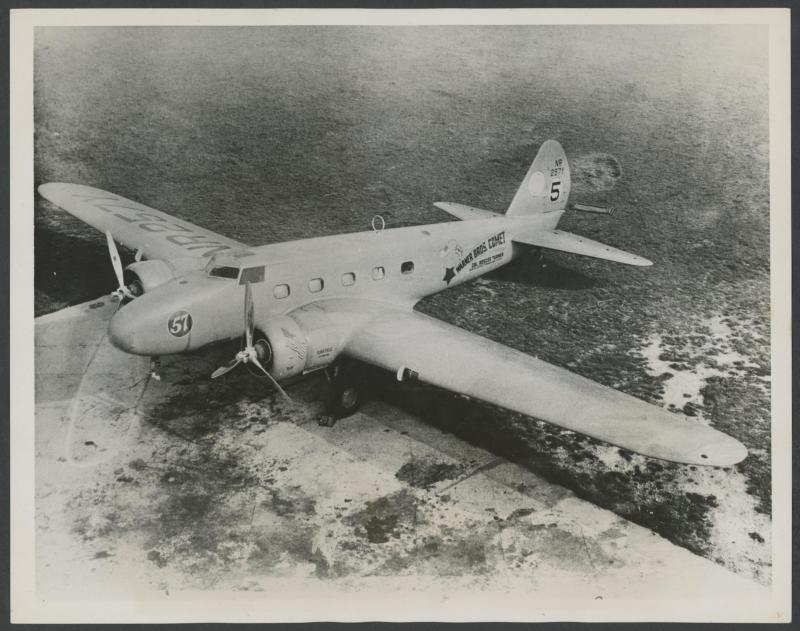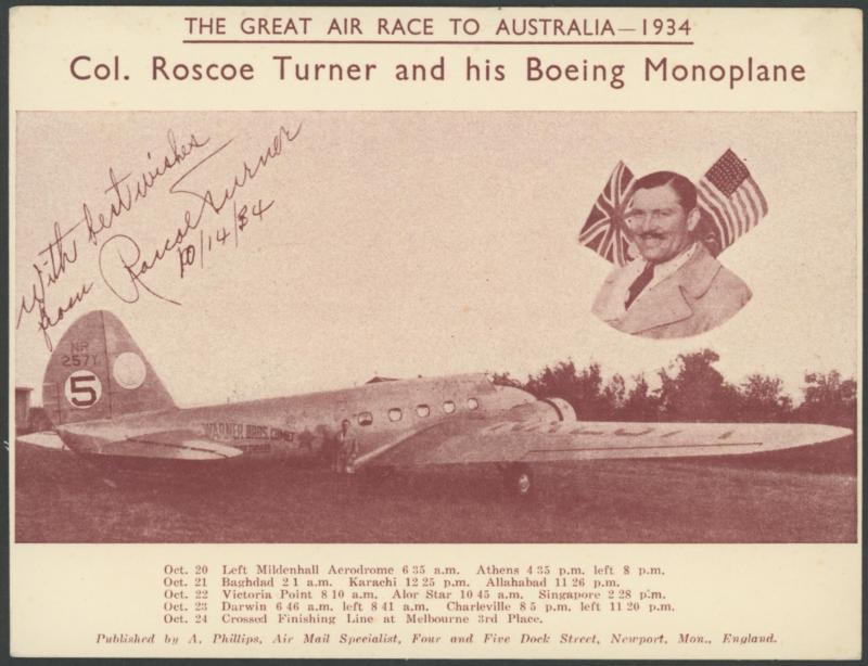 arrival cds, small race cachet in violet signed "Roscoe Turner" in green, AAMC 434, Cat $100; plus very fine promotional card of Turner & his Boeing 247 named 'Warner Bros Comet', large Acme Newspictures photo of the plane x2 (one in flight over