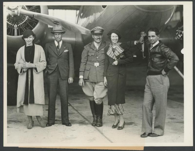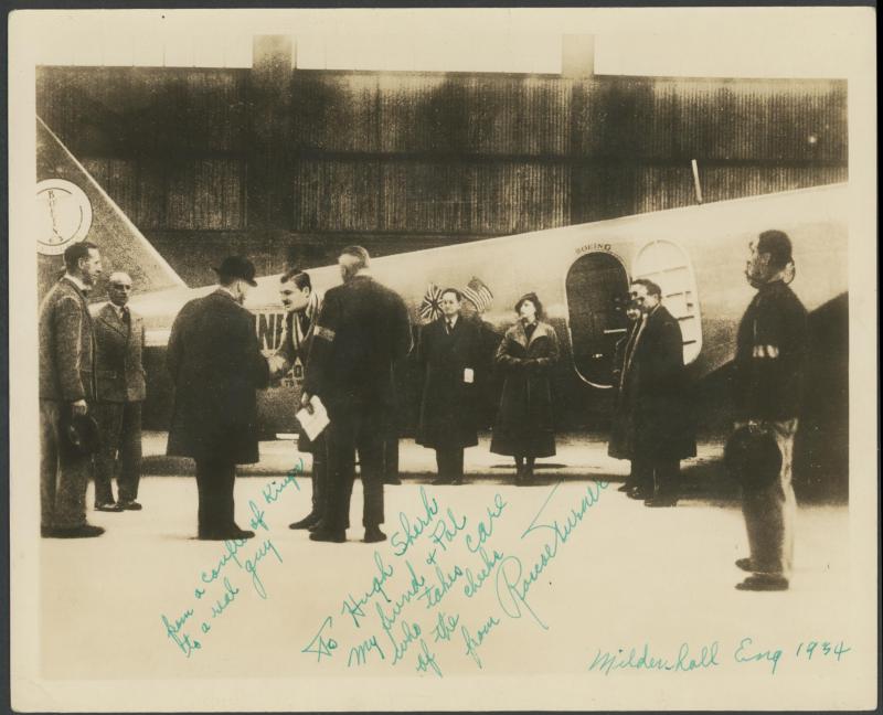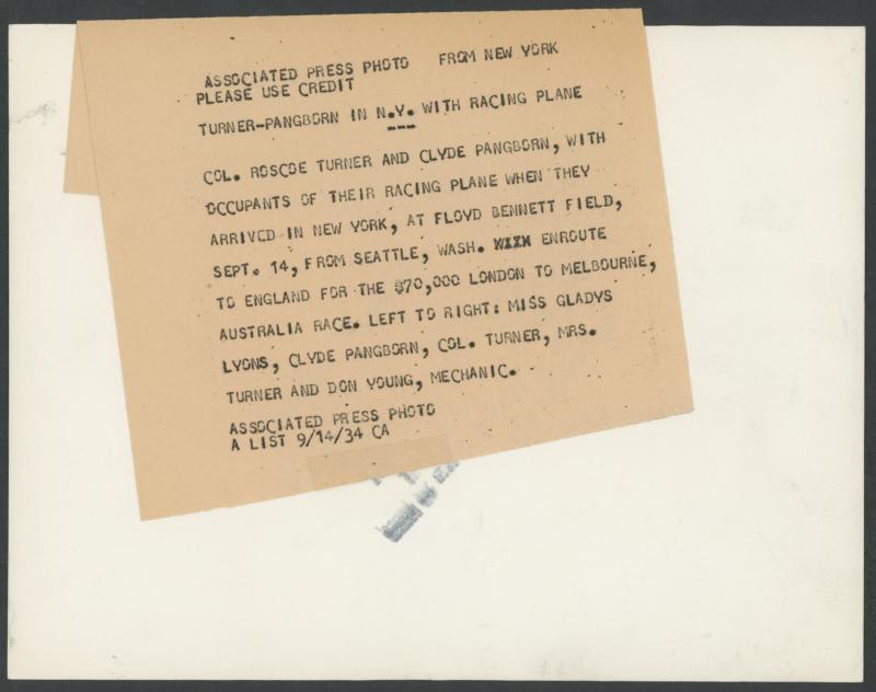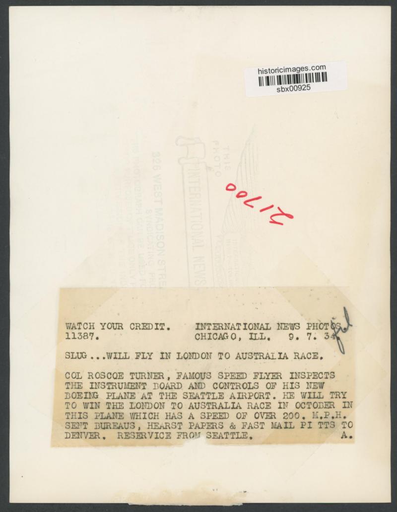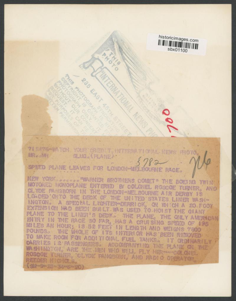have offered. Plus large news photographs of Roscoe Turner taking delivery of Boeing 247 named 'Warner Bros Comet; Turner & Pangborn with the plane at New York; and the wingless plane being loaded onto SS 'Washington' bound for England.