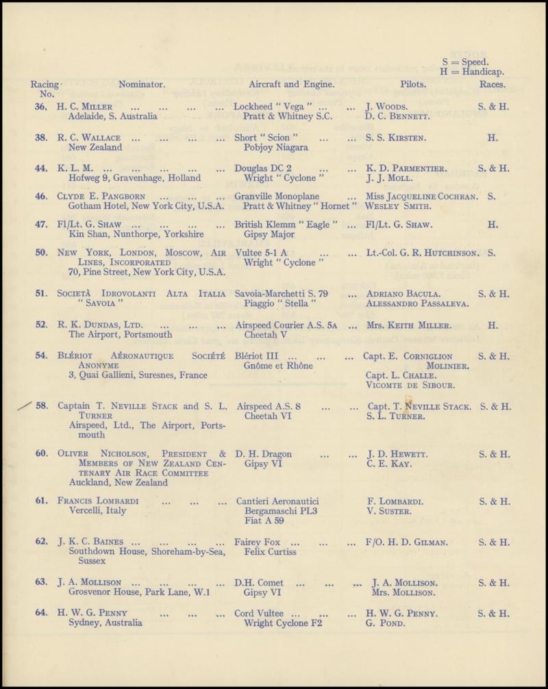 place), "C James Melrose" (3rd in the handicap), "JD Hewitt" & "Cyril Kay", others who failed to finish including "Ray Parer" (withdrew at Paris), "HL Brook" & Miss "EM Lay" (withdrew at Rome), Miss "Jackie Cochran" & "Wesley S Smith" (withdrew at