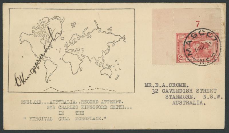 1933 Crome cover with printed world map England-Australia per Charles Kingsford Smith & signed by him, KSMith 2d Plate Number '7'