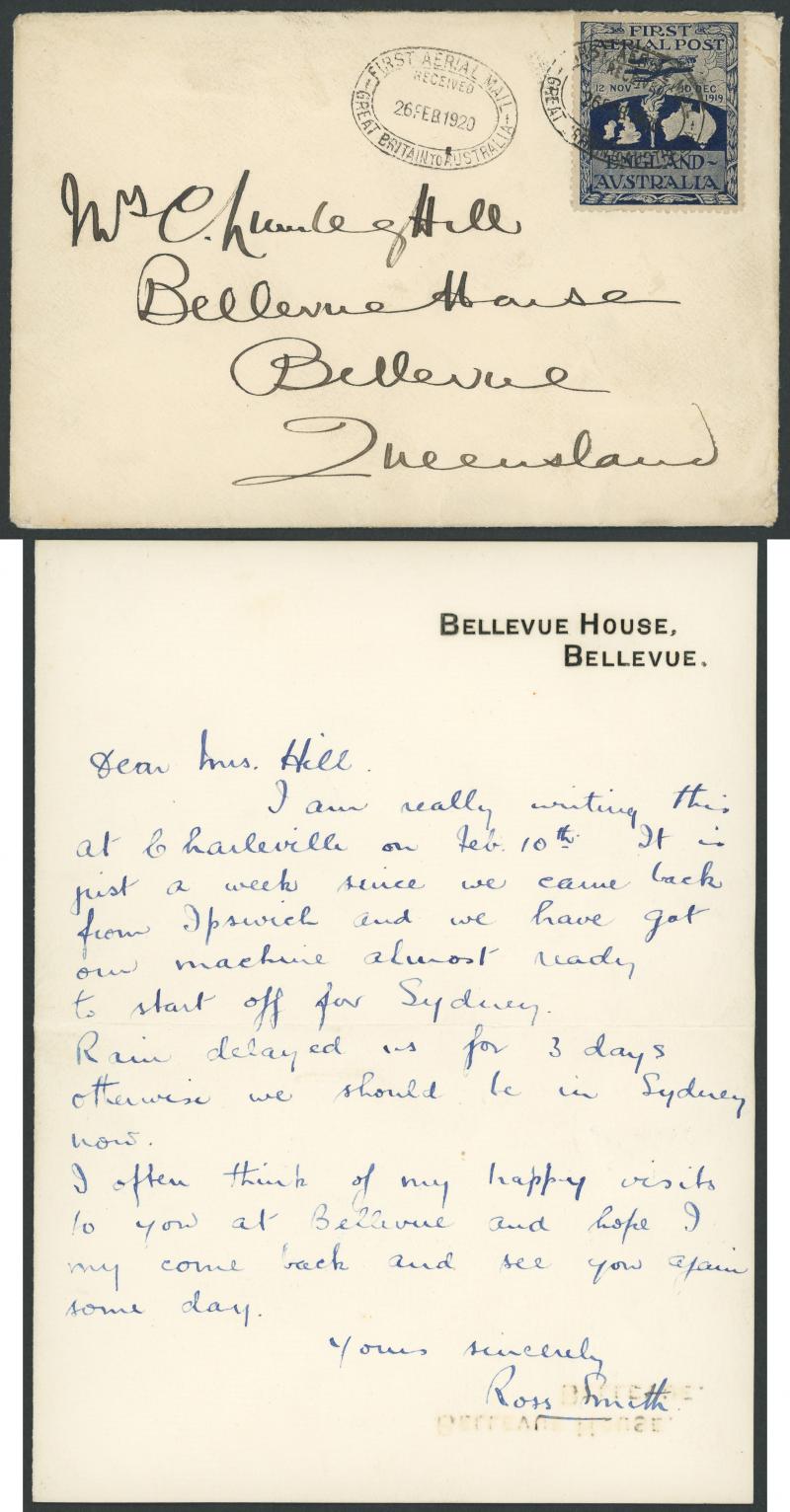 Bellevue, Queensland" with enclosed letter written & signed by him on Bellevue House notepaper, a very fine well-centred example of the 'FIRST/AERIAL POST/ENGLAND-/AUSTRALIA' flight vignette tied by one of two very fine strikes of the large
