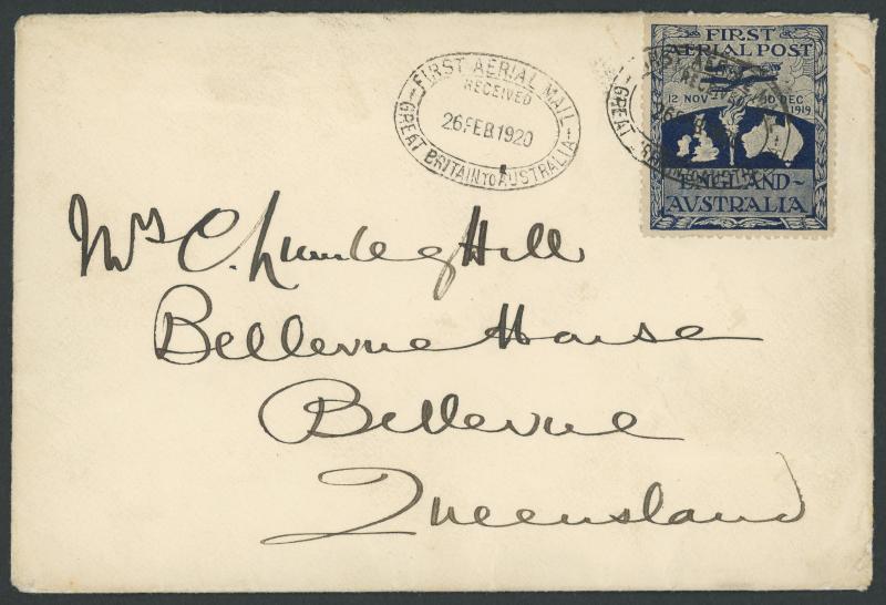 double-oval 'FIRST AERIAL MAIL/RECEIVED/ 26FEB1920/ GREAT BRITAIN TO AUSTRALIA' datestamp, a couple of tiny trivial blemishes otherwise superb, AAMC 27a, Cat $5750+ (2008).