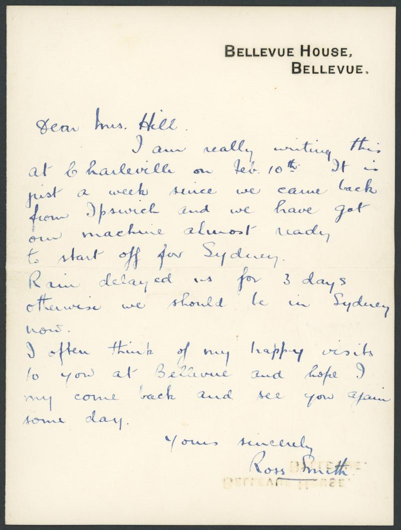 engine and propellor were repaired at the Ipswich Railway Workshops. Ross Smith had presumably visited Bellevue House, and taken with him the notepaper on which this letter is written; it reads in part "... writing this at Charleville on Feb 10th. It