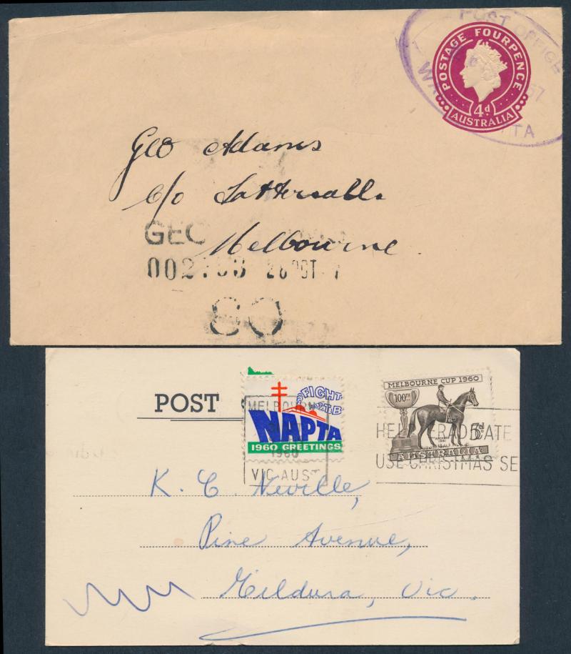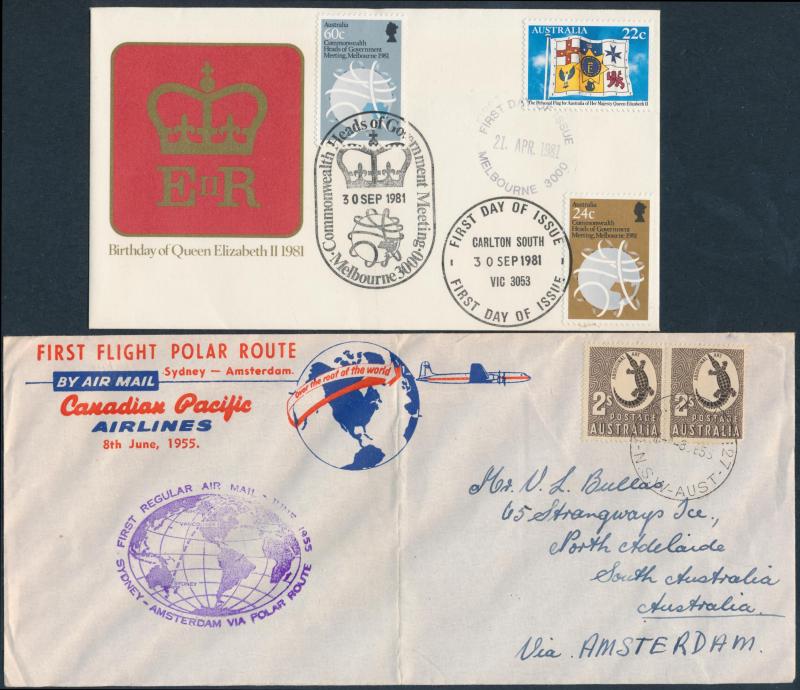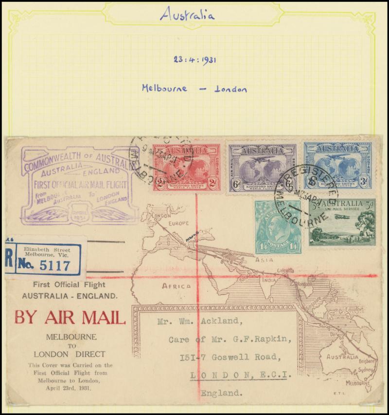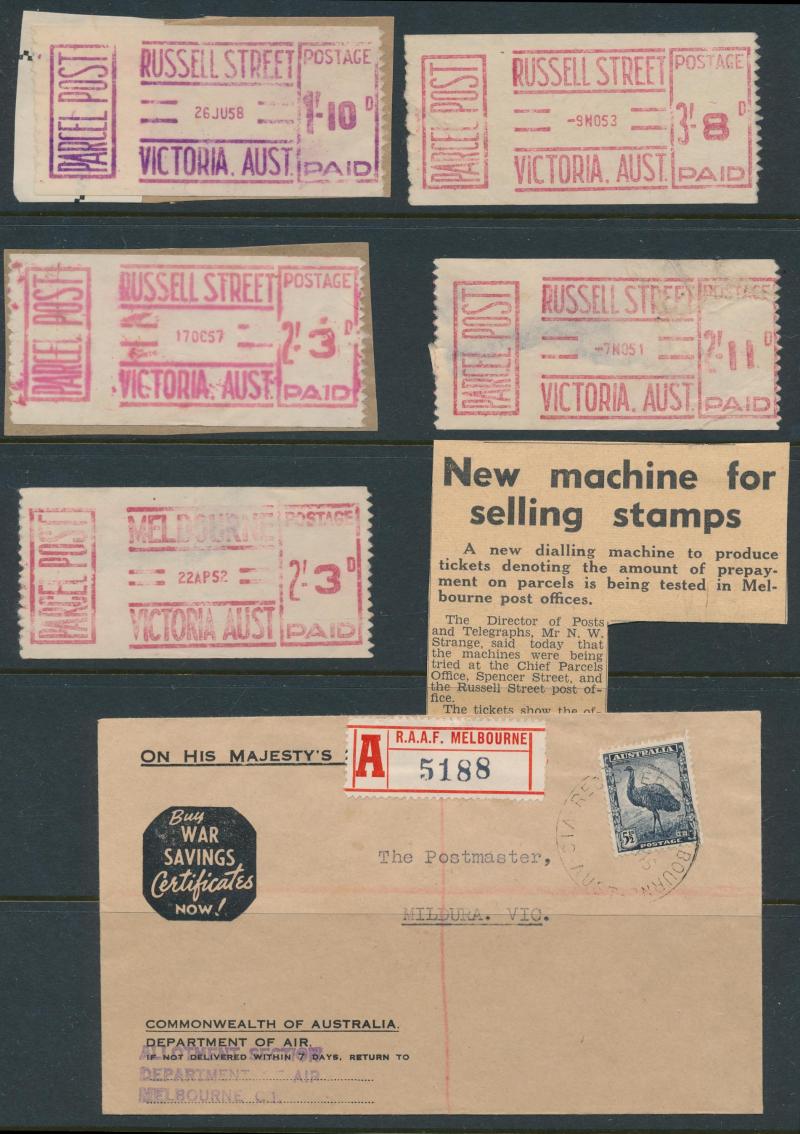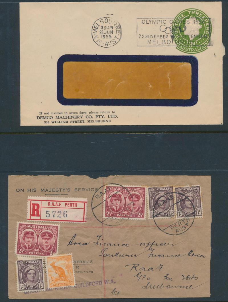 types and with high thematic content, 1945 OHMS registered covers with Melbourne cds & red/white 'RAAF MELBOURNE' R label with 'A' instead of 'R' (must be rare) and from Guildford RAAF with 'RAAF/PERTH/AUST' cds & red/white 'RAAF PERTH' R label,