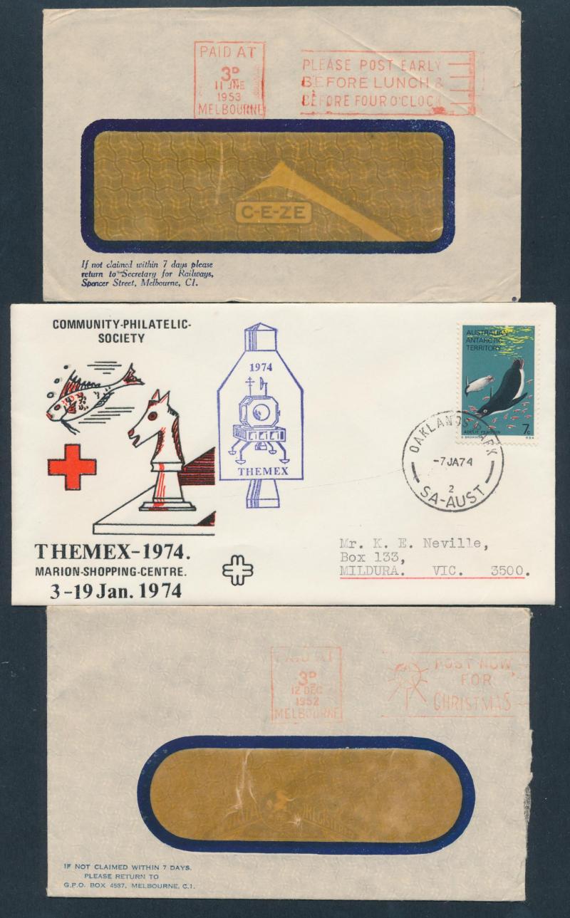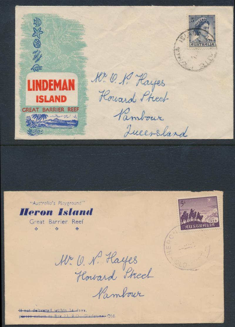 100s of modern covers, printed tourist covers from 'HERON ISLAND' (very scarce) & illustrated 'LINDEMAN ISLAND', some postal stationery, also 1951-58 Automatic Parcel Post Labels for Melbourne 2/3d and Russell Street 1/10d, 2/3d, 2/11d & 3/8d (not