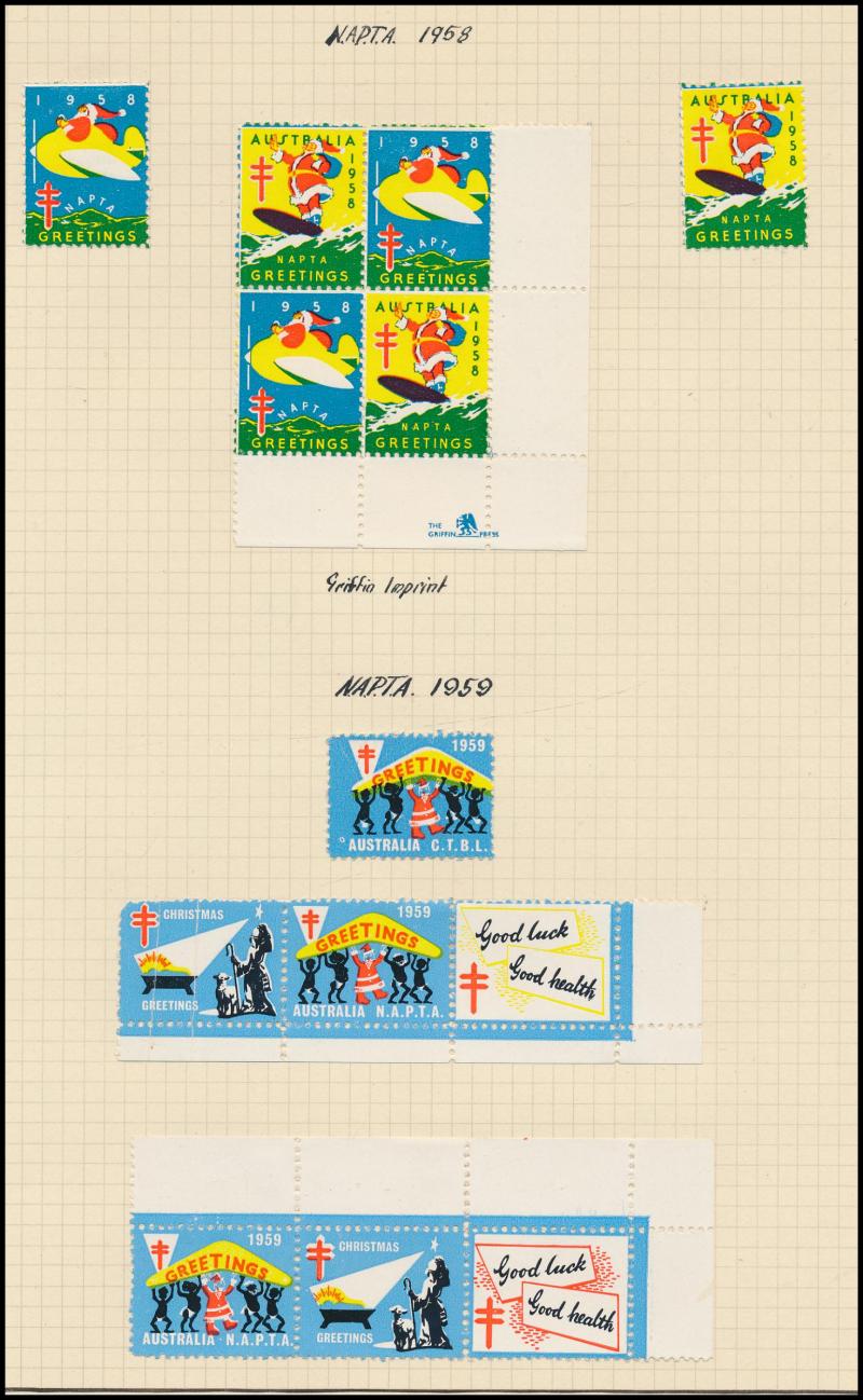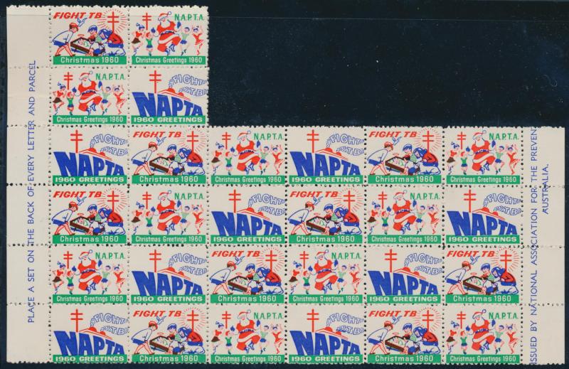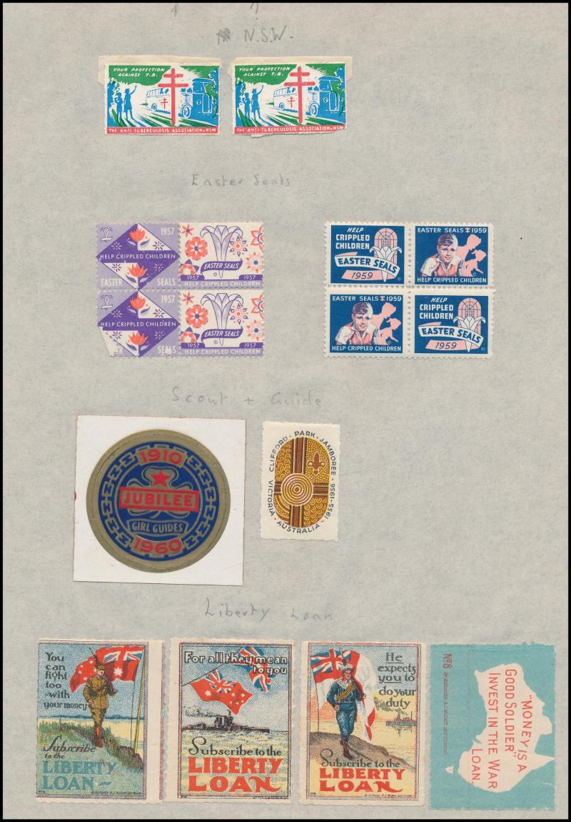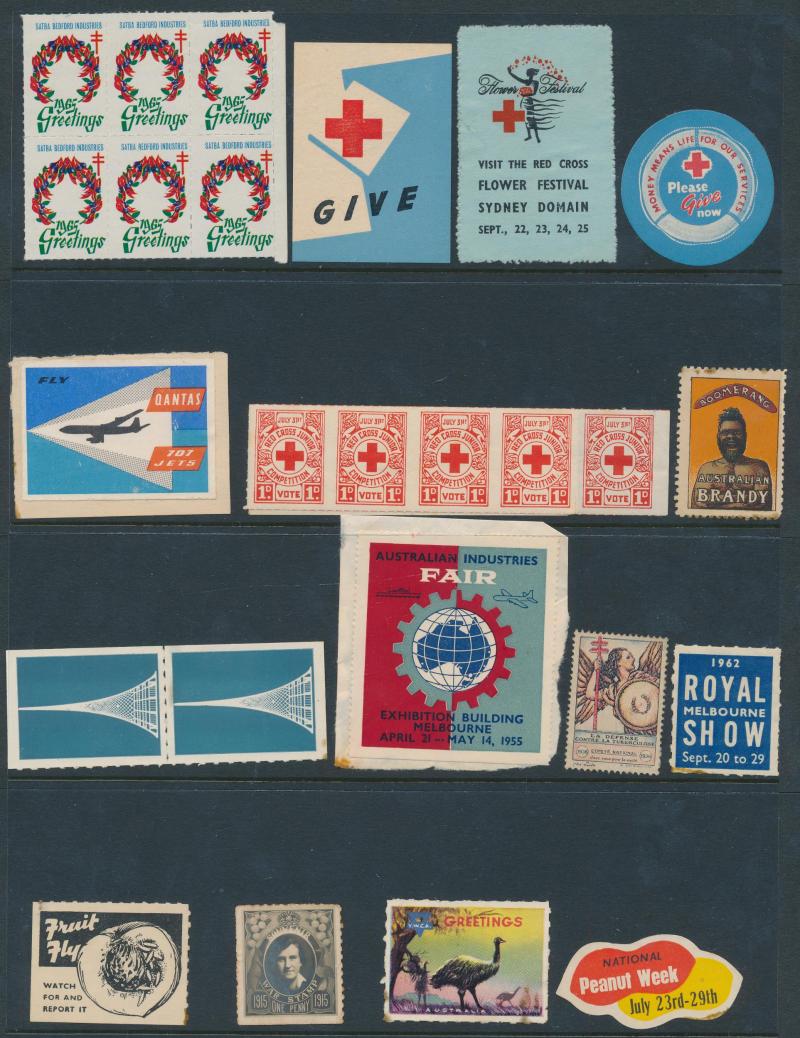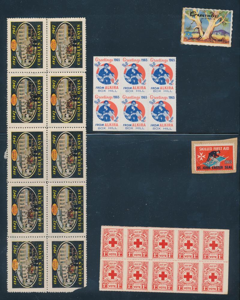 few propaganda labels, 1947 Charles Davis Ltd mint block of 8, 1965 Akira Box Hill block of 6, then an extensive array of Anti-TB/Christmas seals including several complete sheets and some foreign material including from America, Scandinavia & France