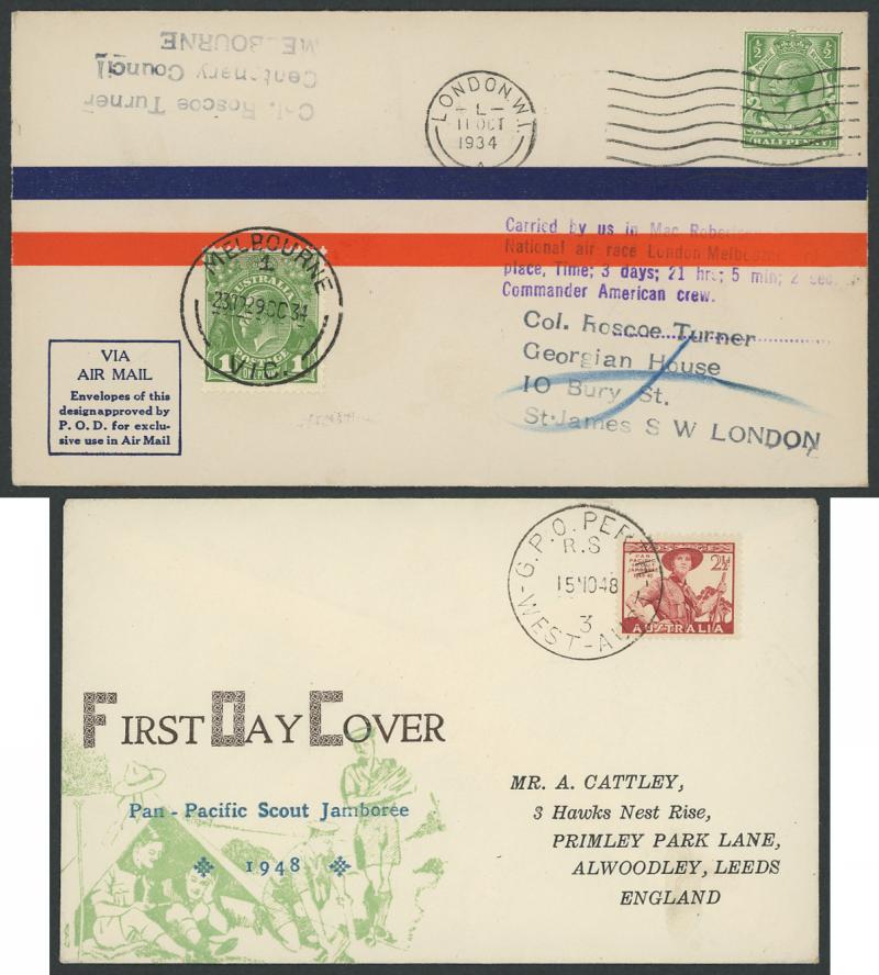 5/- and a few into the early Decimal period, then a range of mainly Pre-Decimal Flight Covers including a Roscoe Turner MacRobertson Air Race cover, plus postal stationery some commercial usages including from Rabaul, Tin Can Mail, etc. (180+) (Image1) (Image2)