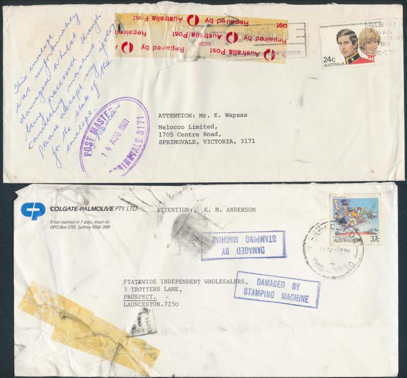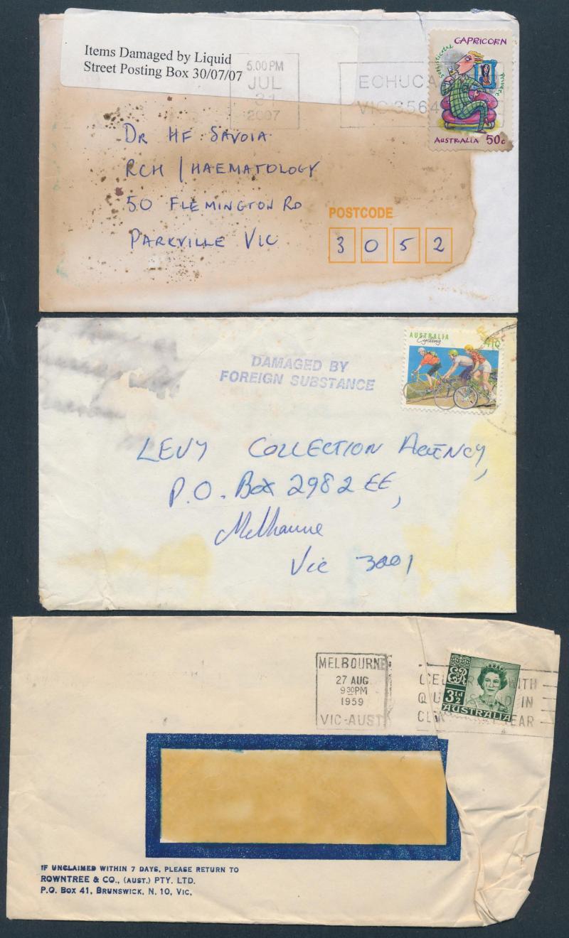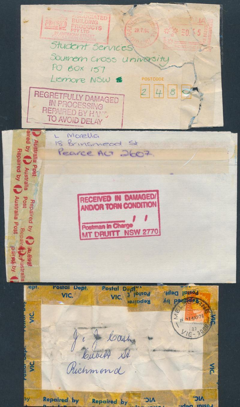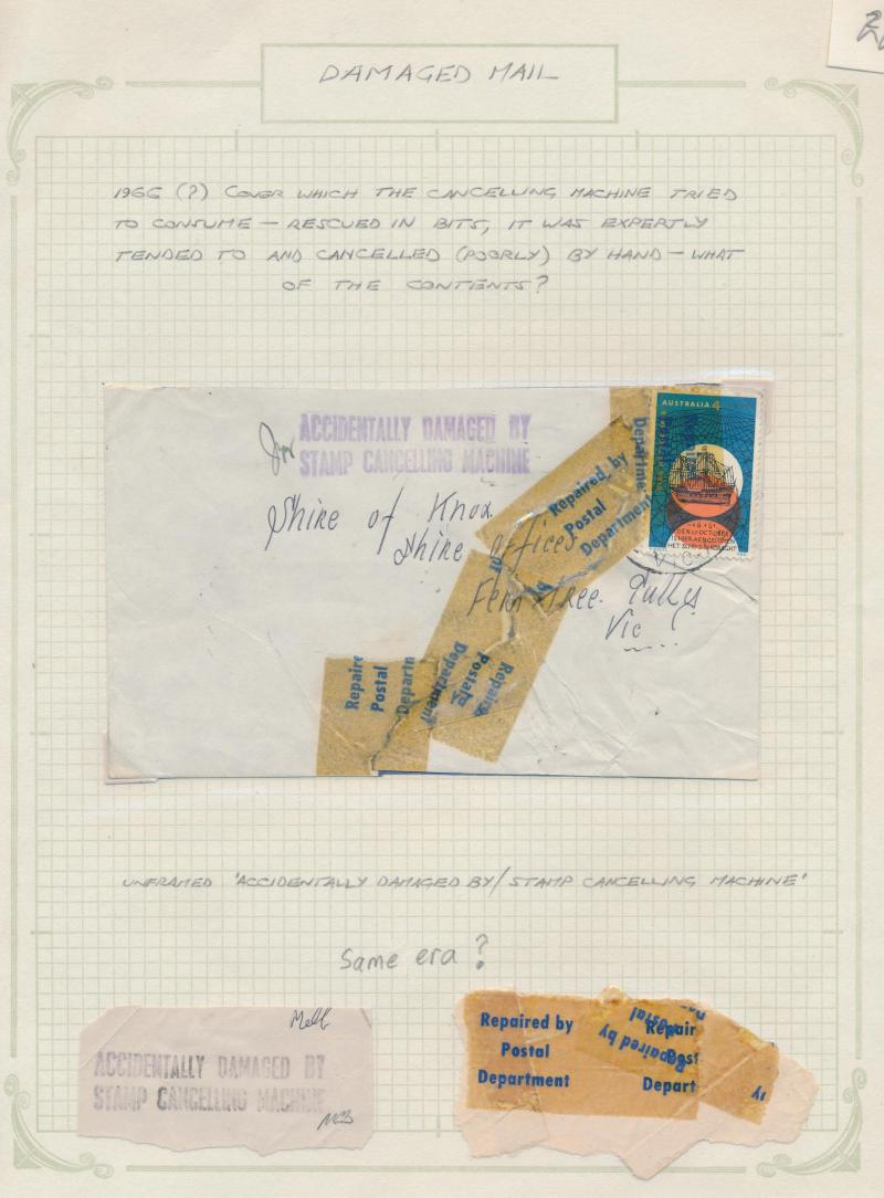 Mostly Decimal era 'disaster mail' comprising items damaged in the post, mutilated in postmarking machinery, etc, good variety of