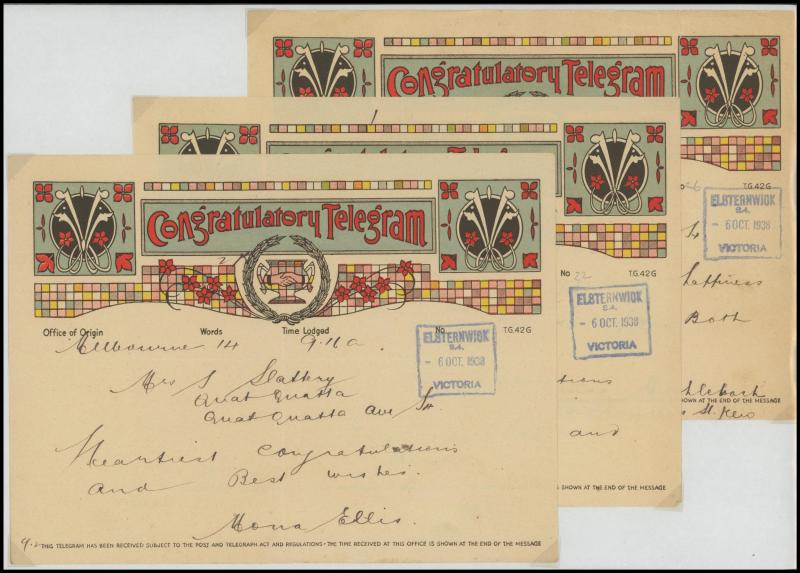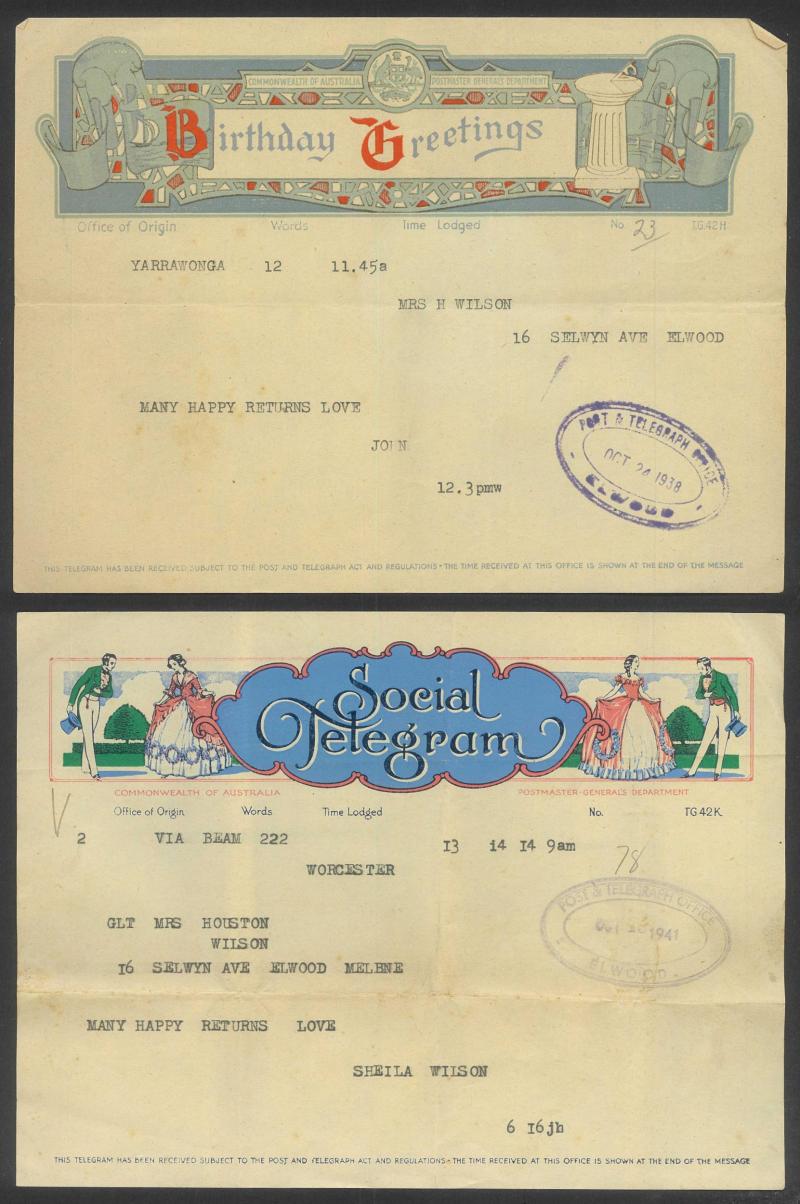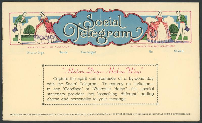 form, 1936-41 pictorial forms 'Birthday Greetings', 'Mothers Day Greeting', and 'Social Telegram' x3 (one with 'INTERNATIONAL TELEGRAM' label affixed) plus complete PMGs Department promotional booklet for the initial six different styles, then a