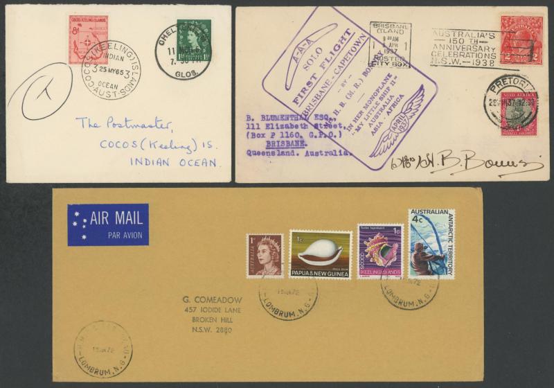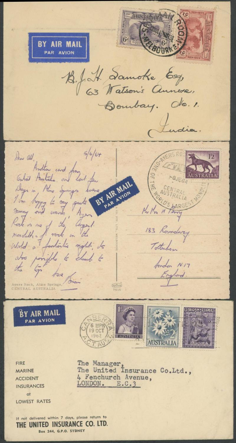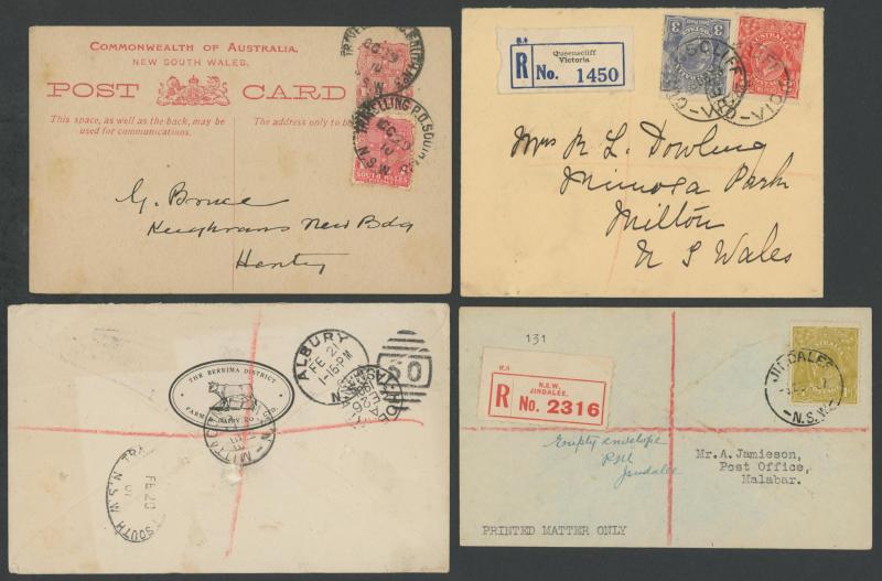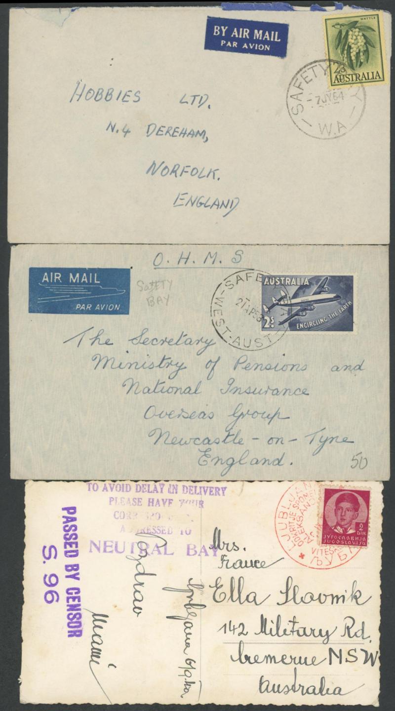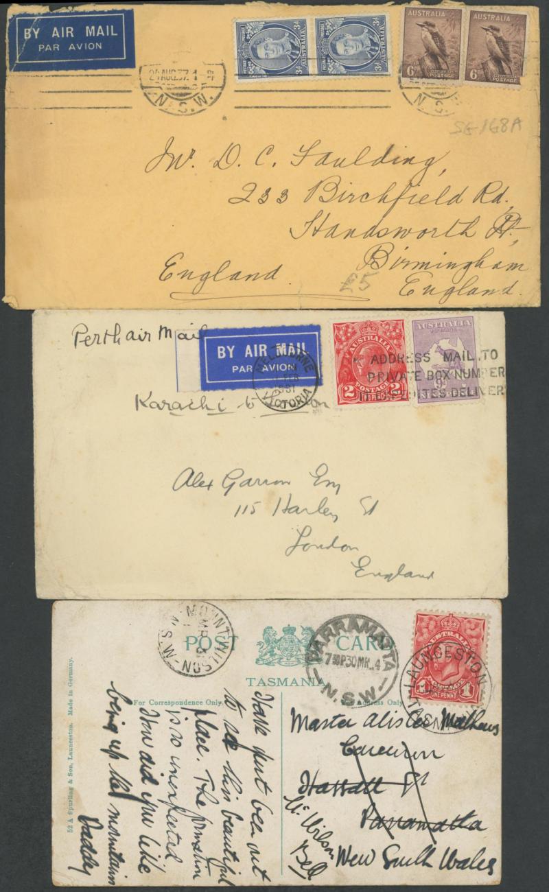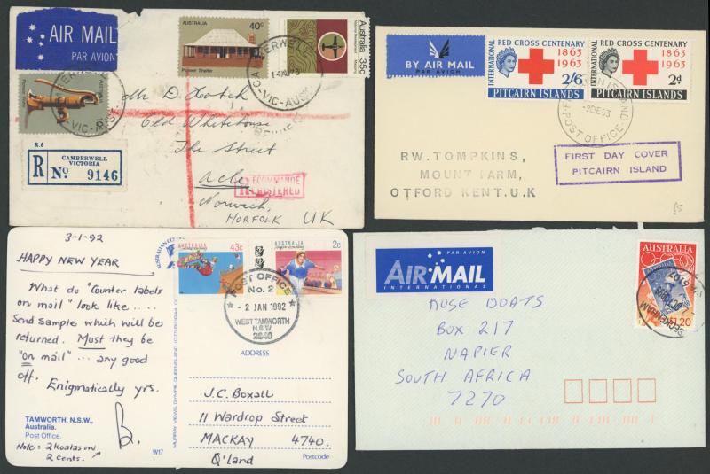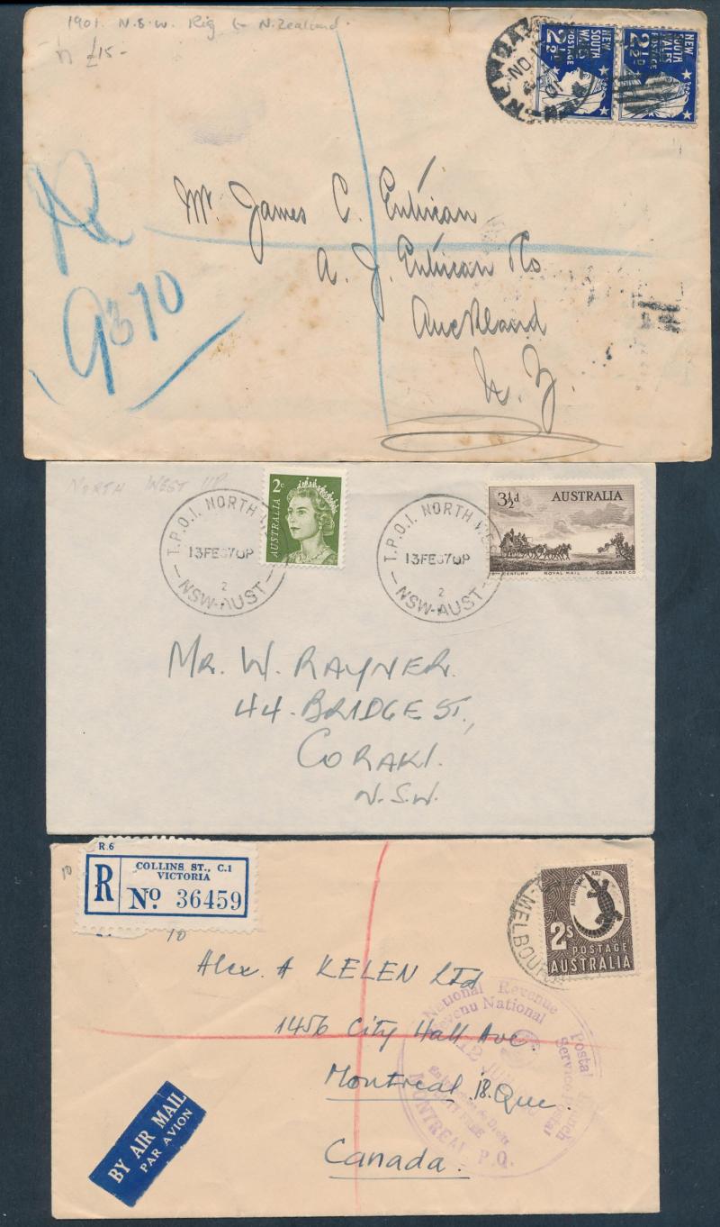 with NSW 1d punctured 'WC', 1911 NSW cover to Aland with '...MARIEHAMN' arrival backstamp, 1949 from "Pierces Creek/via Canberra" with 'KINGSTON/ACT-AUST' cds & R label, 1955 with scarce 'ROCKY GULLY/WEST-AUST' cds, etc; Airmails including 1935 to GB