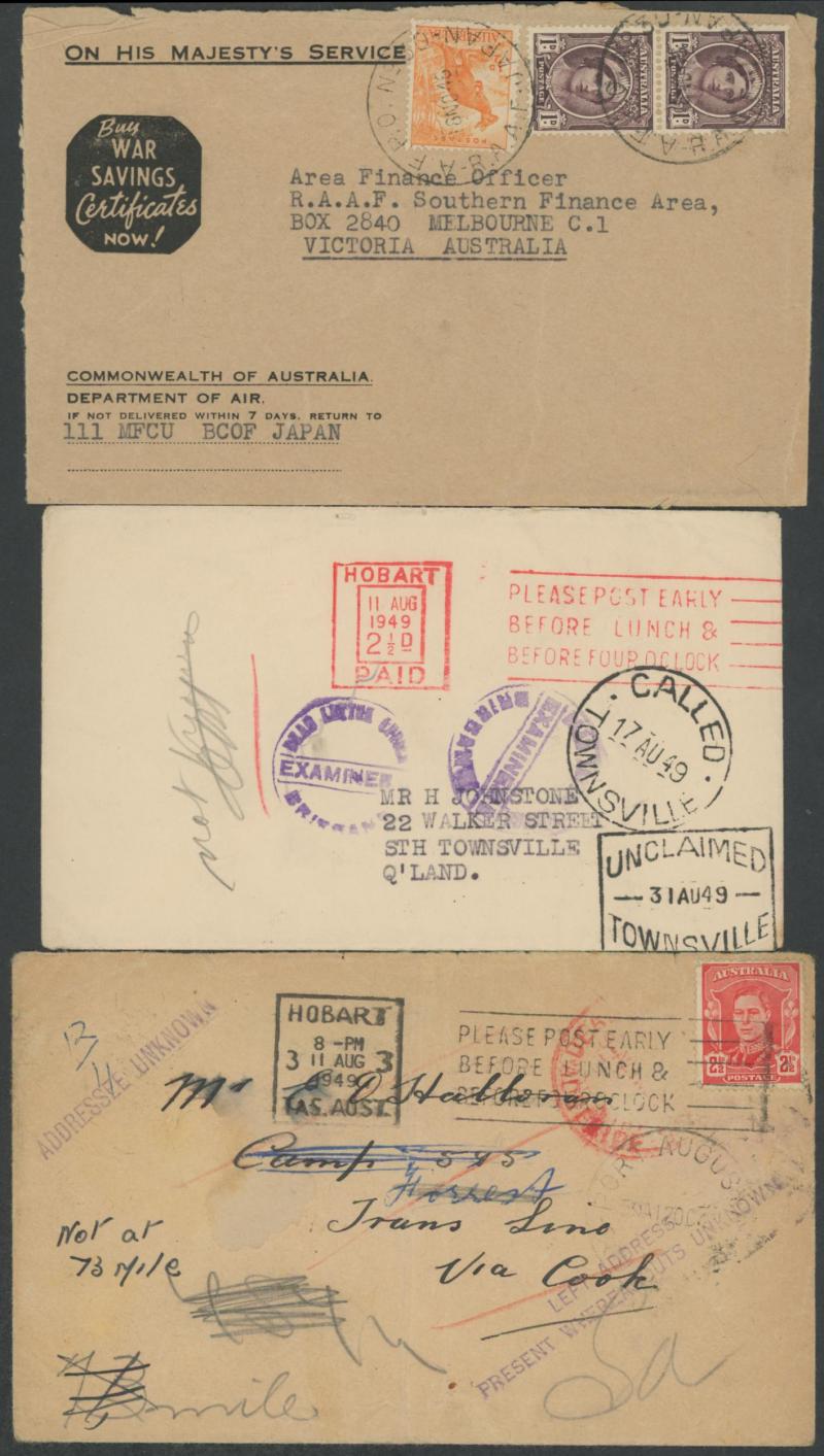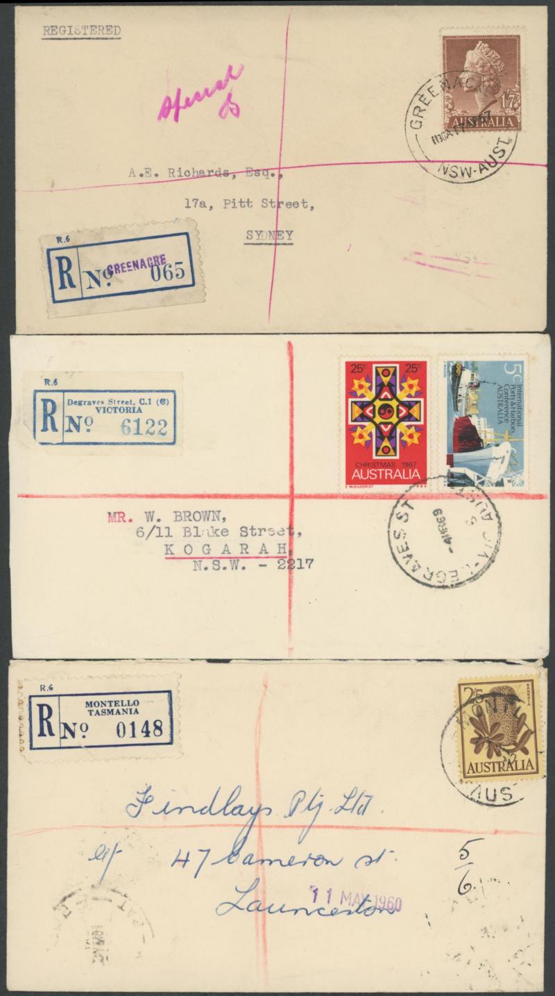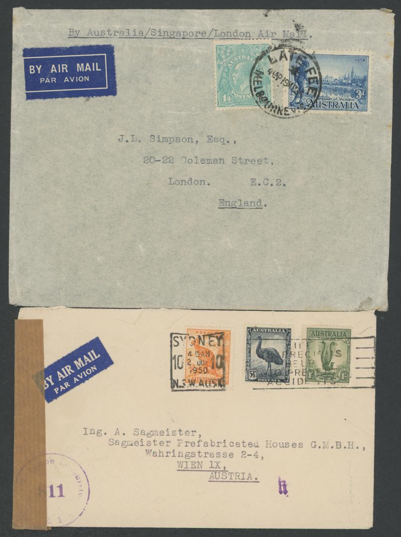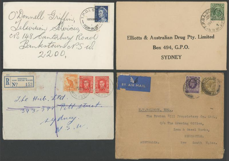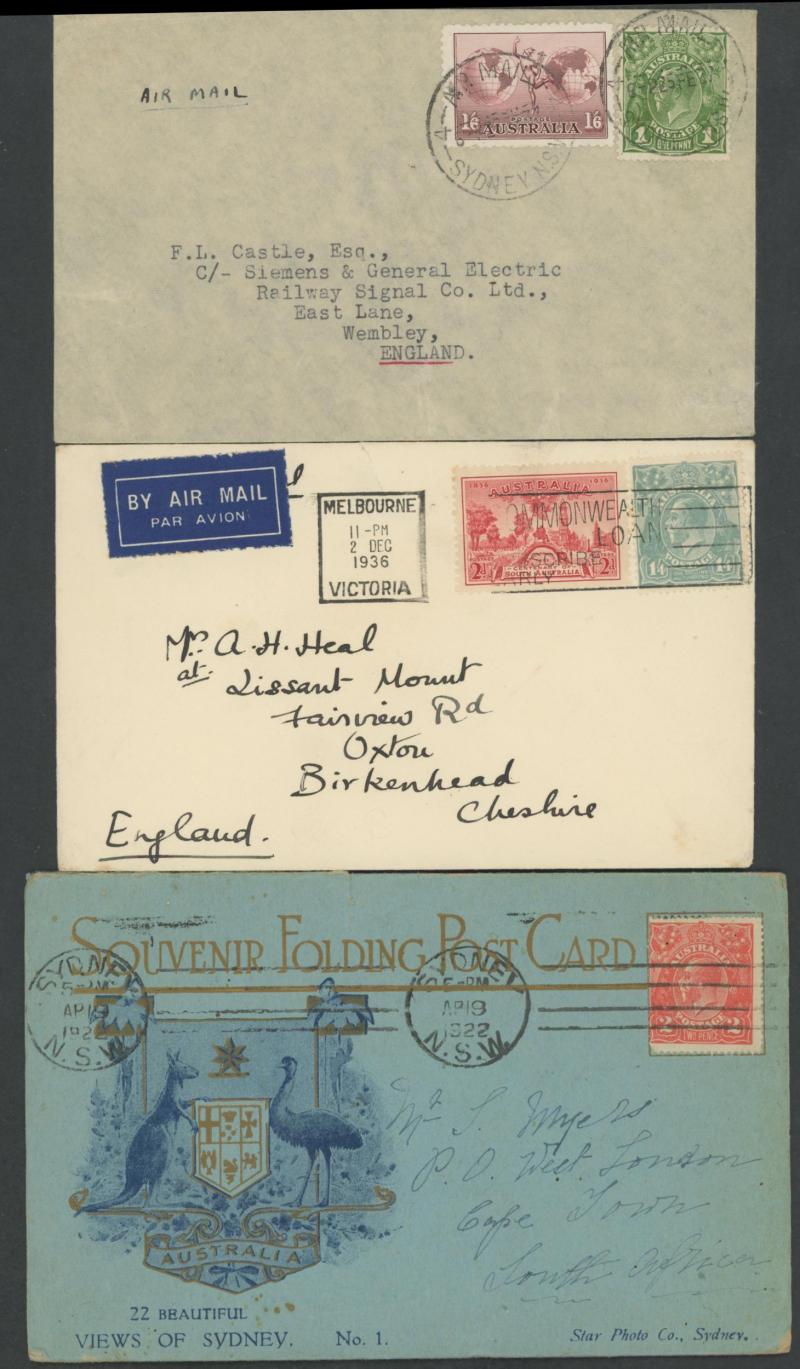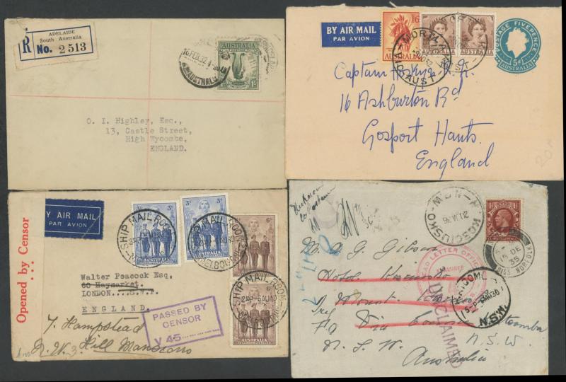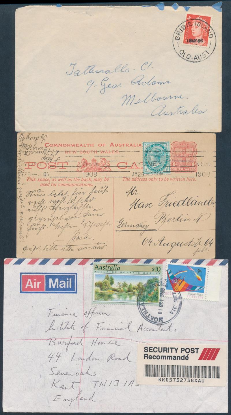 with NSW 1d punctured 'WC', 1911 NSW cover to Aland with '...MARIEHAMN' arrival backstamp, 1949 from "Pierces Creek/via Canberra" with 'KINGSTON/ACT-AUST' cds & R label, 1955 with scarce 'ROCKY GULLY/WEST-AUST' cds, etc; Airmails including 1935 to GB