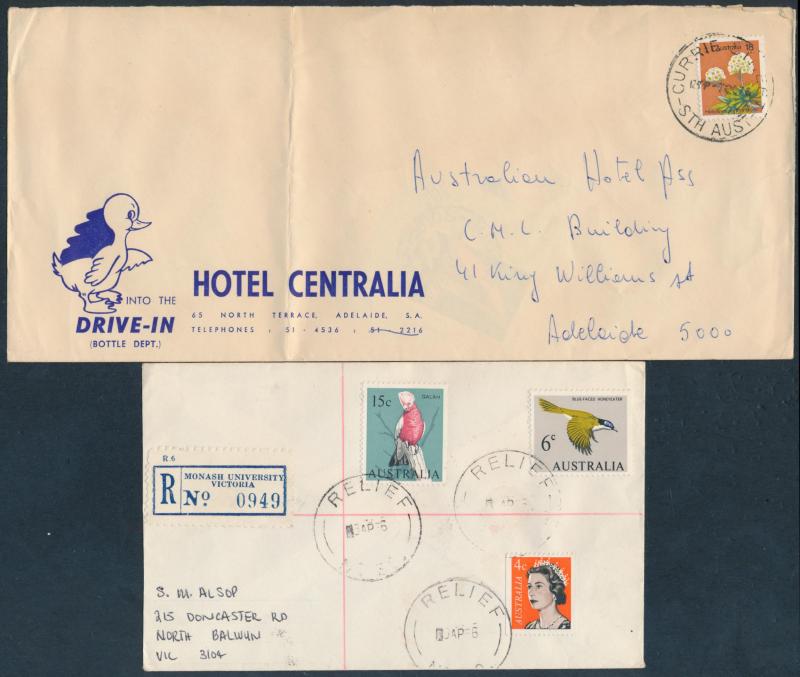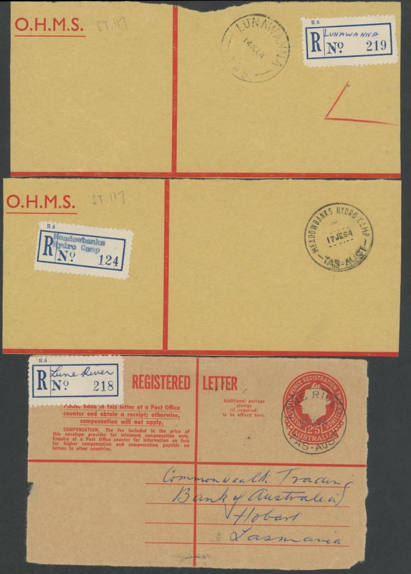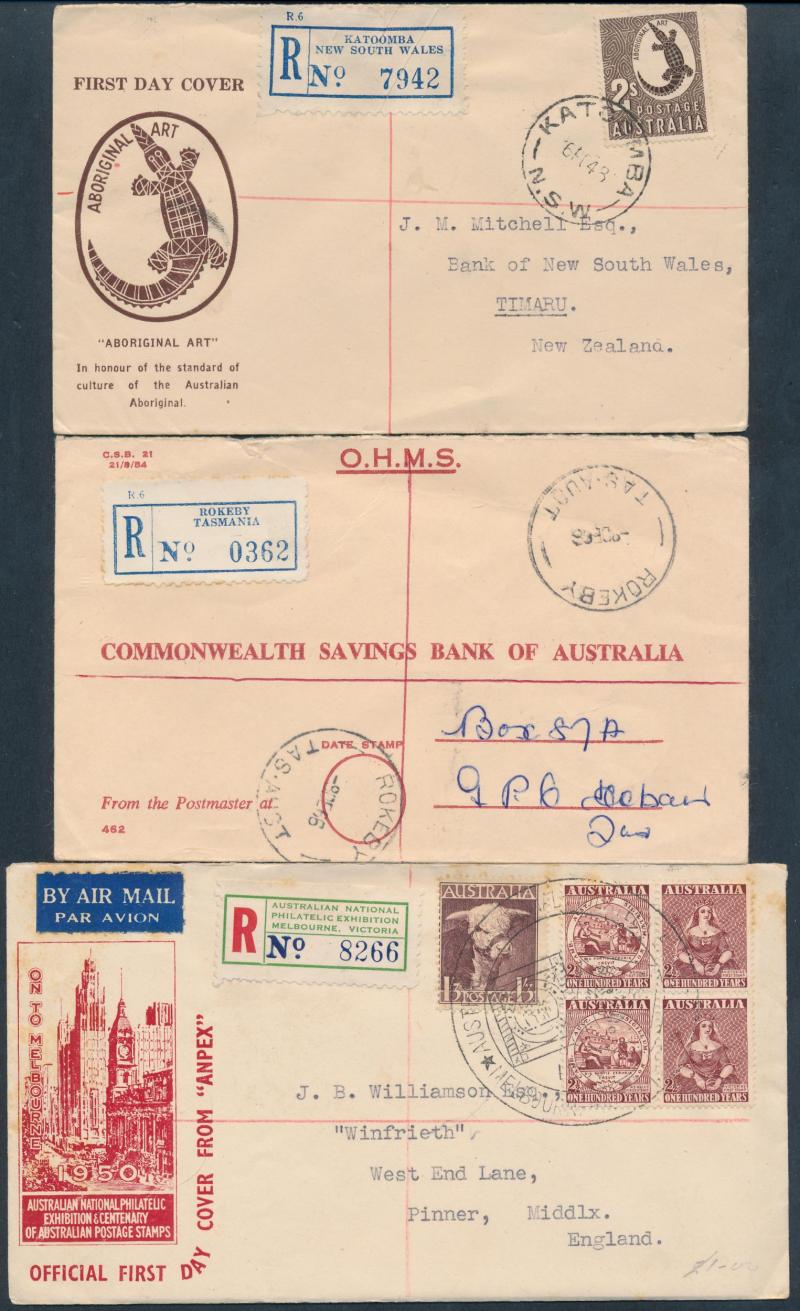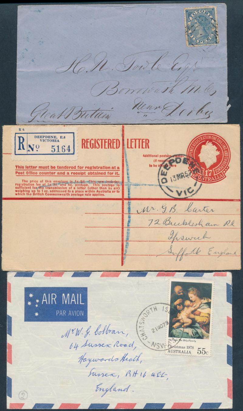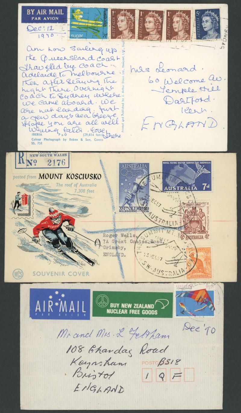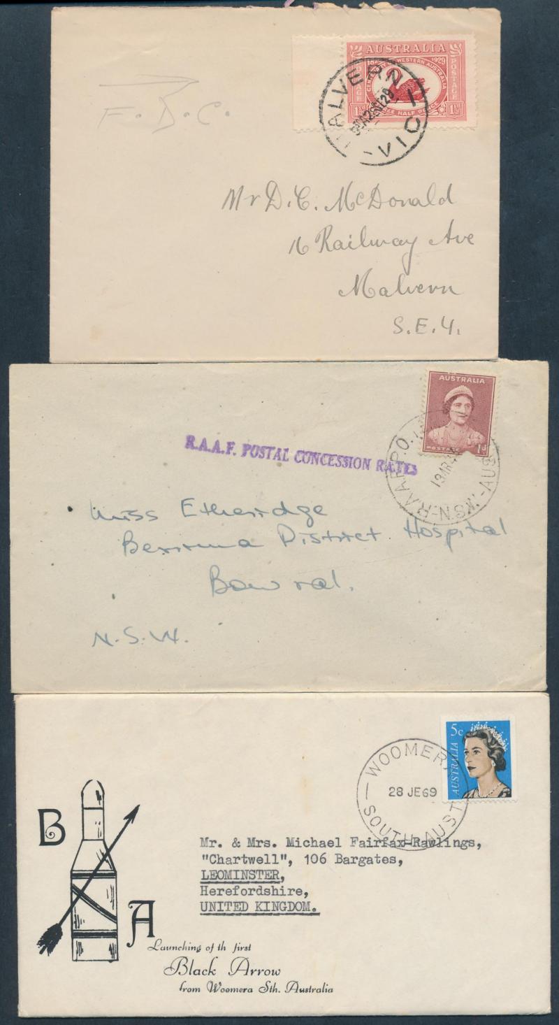 with NSW 1d punctured 'WC', 1911 NSW cover to Aland with '...MARIEHAMN' arrival backstamp, 1949 from "Pierces Creek/via Canberra" with 'KINGSTON/ACT-AUST' cds & R label, 1955 with scarce 'ROCKY GULLY/WEST-AUST' cds, etc; Airmails including 1935 to GB