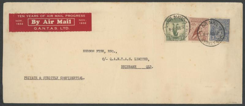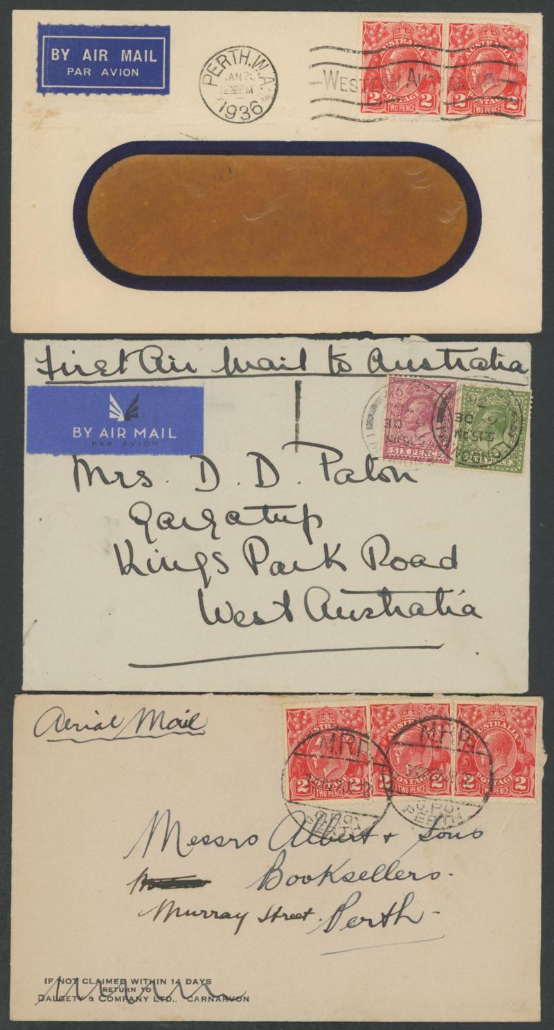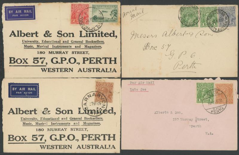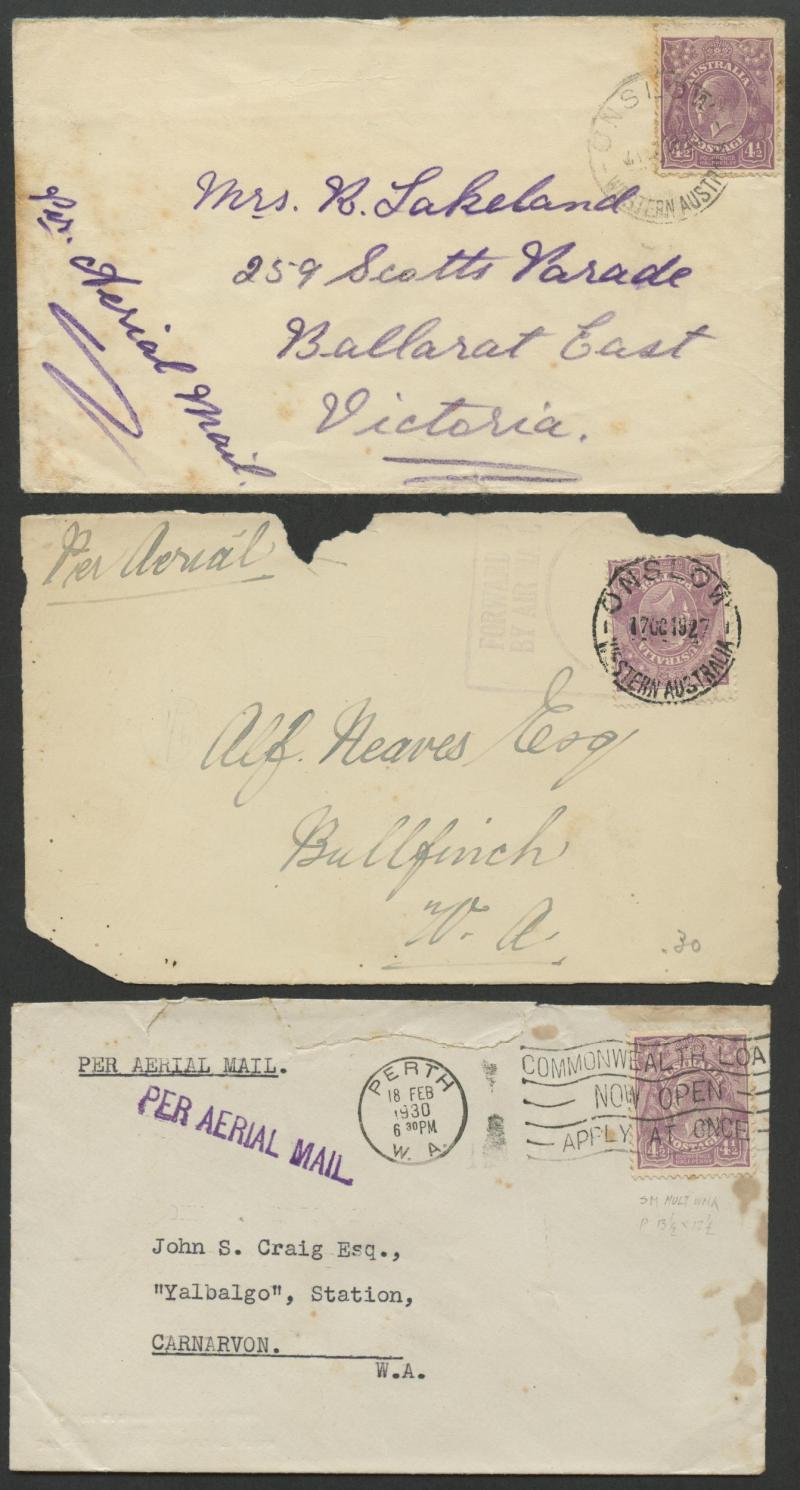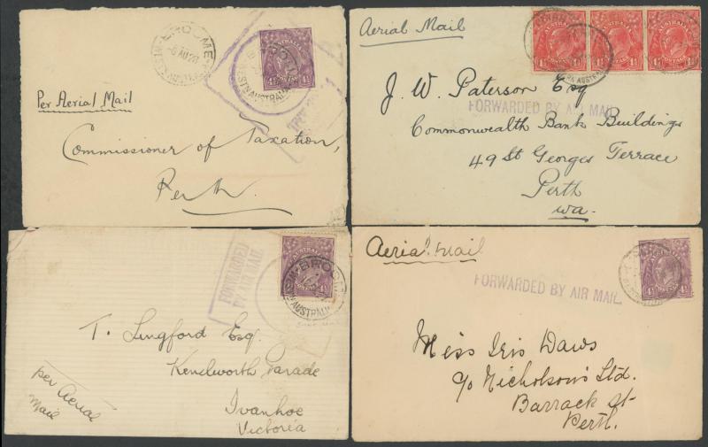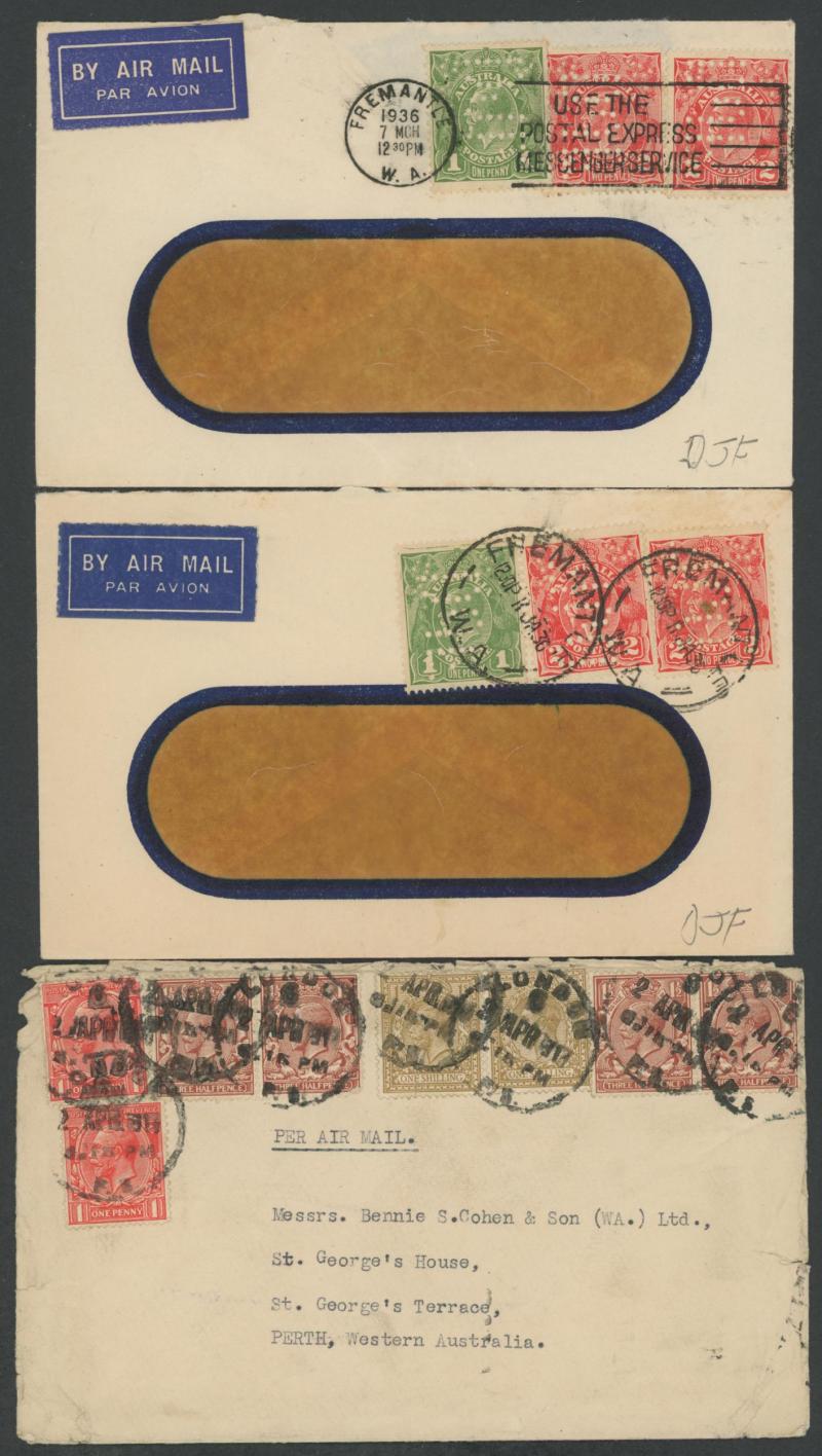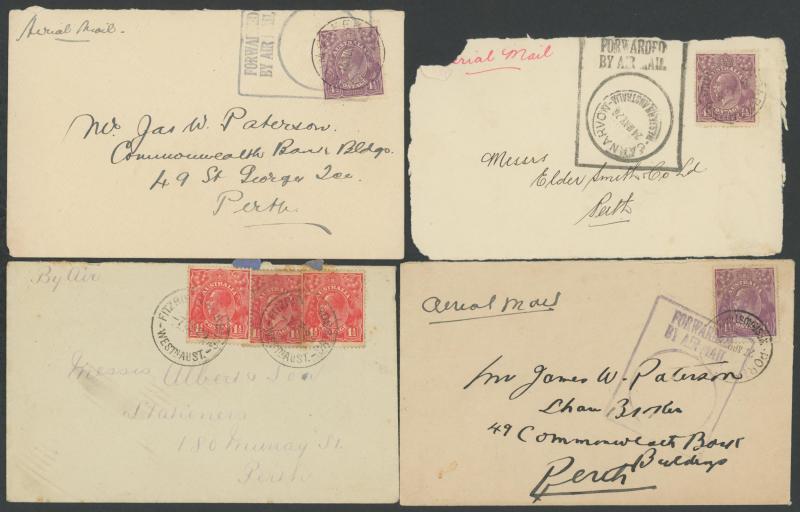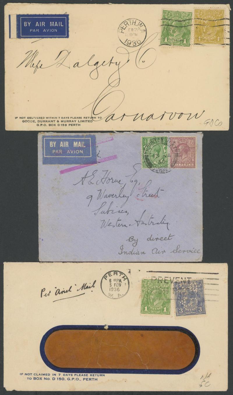 MAIL' from Onslow & 'FORWARDED BY AIR MAIL' from Carnarvon x2, and boxed 'FORWARDED/BY AIR MAIL' from Broome x2, Carnarvon, Onslow, Port Hedland & Whim Creek, Carnarvon-Perth with Vic Centenary 3d x2 + Airmail 3d x5, 1936-37 with commercial perfins