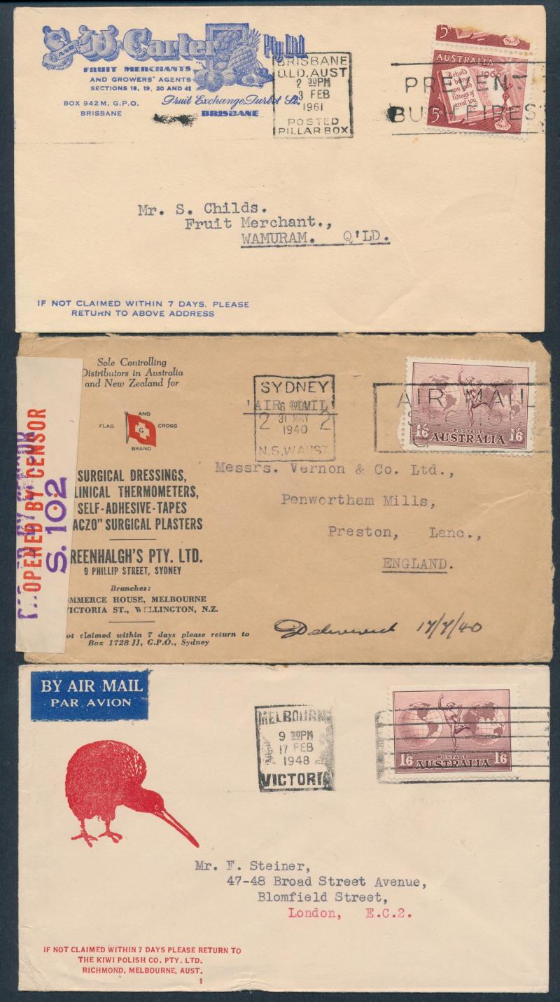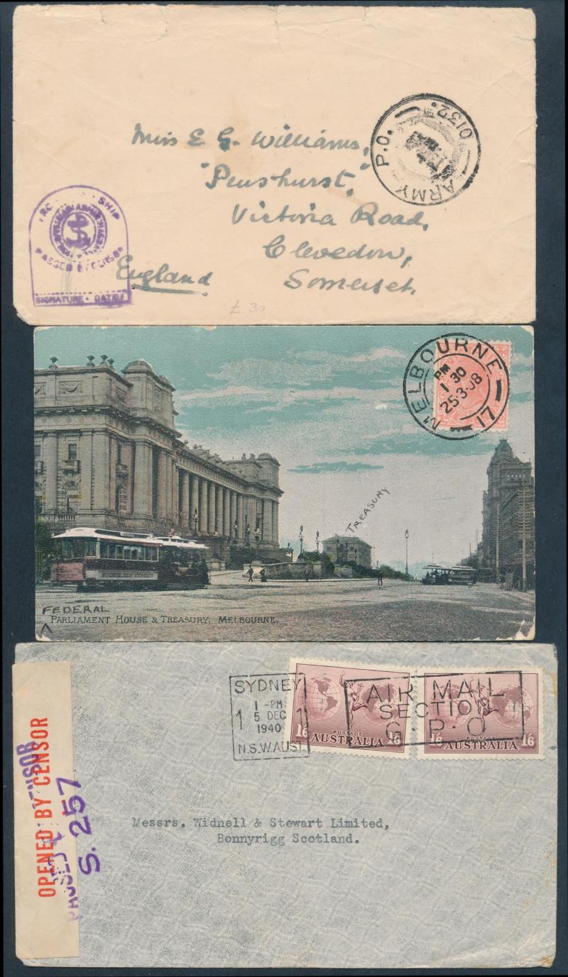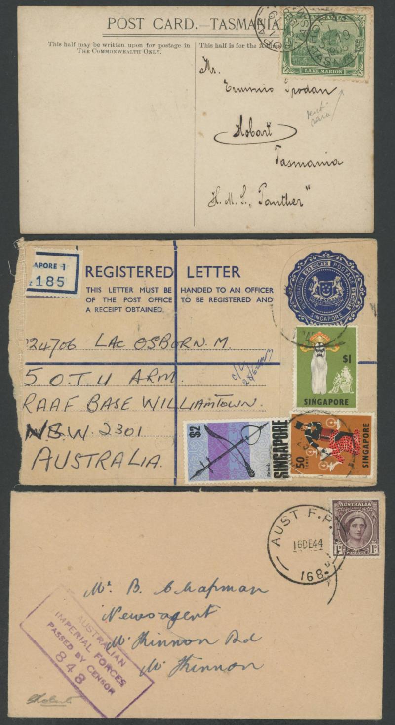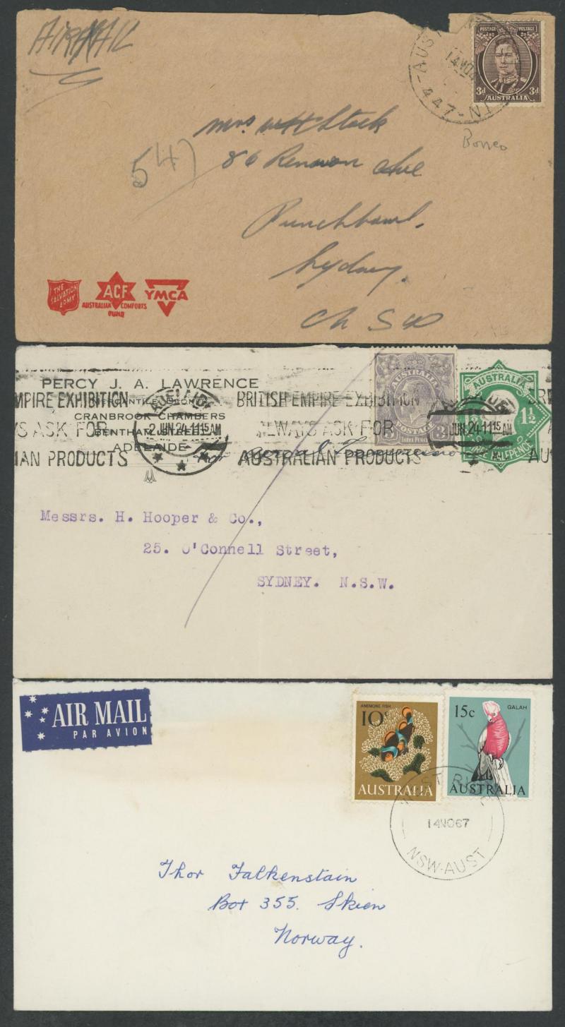 Launceston and inwards from Chile & Ireland, a few POW items including to Singapore, commercial airmails including to Palestine (1941) & Sweden (1937), 1940s-60s advertising covers including embossed envelopes, WWI soldiers' Catholic Prayer Book