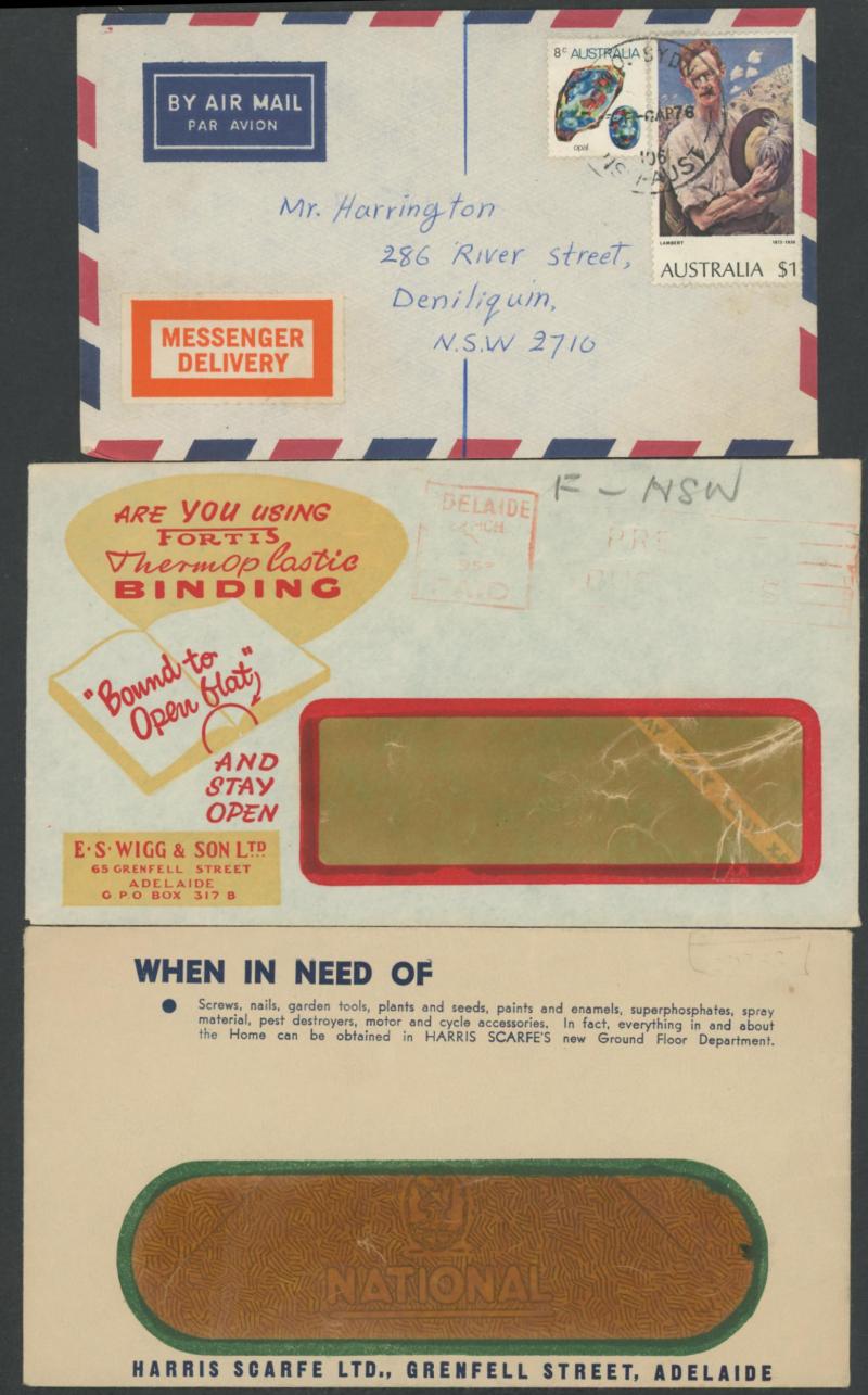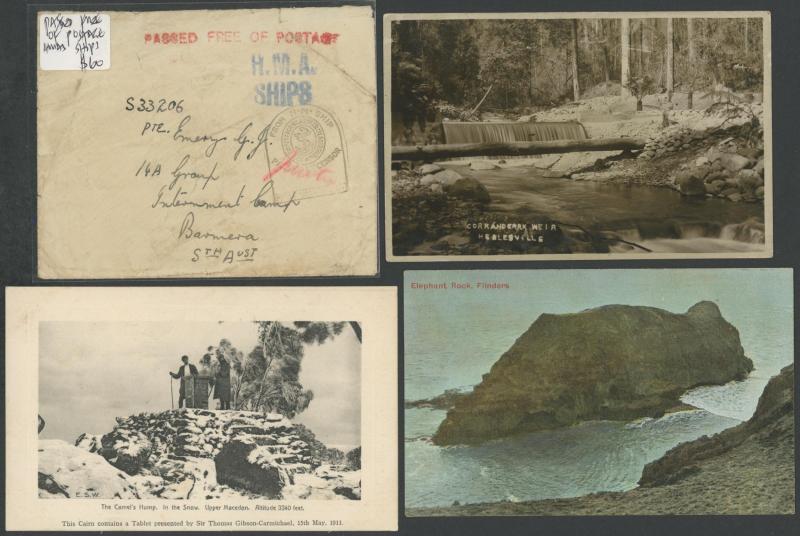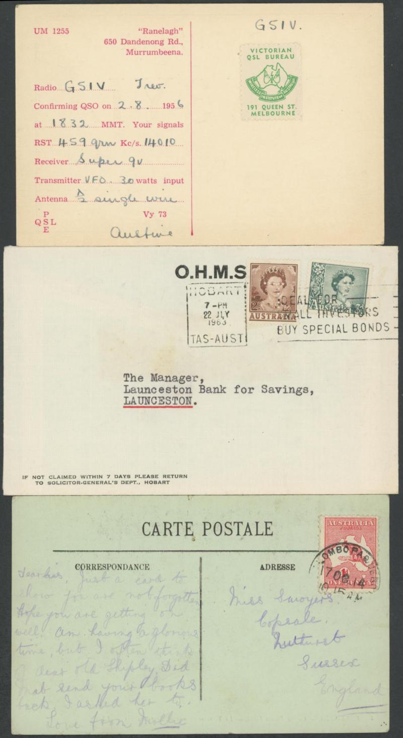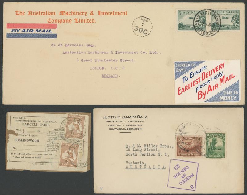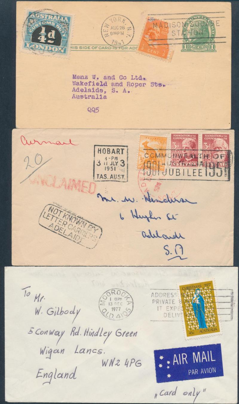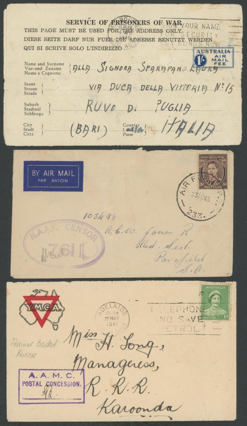 Launceston and inwards from Chile & Ireland, a few POW items including to Singapore, commercial airmails including to Palestine (1941) & Sweden (1937), 1940s-60s advertising covers including embossed envelopes, WWI soldiers' Catholic Prayer Book