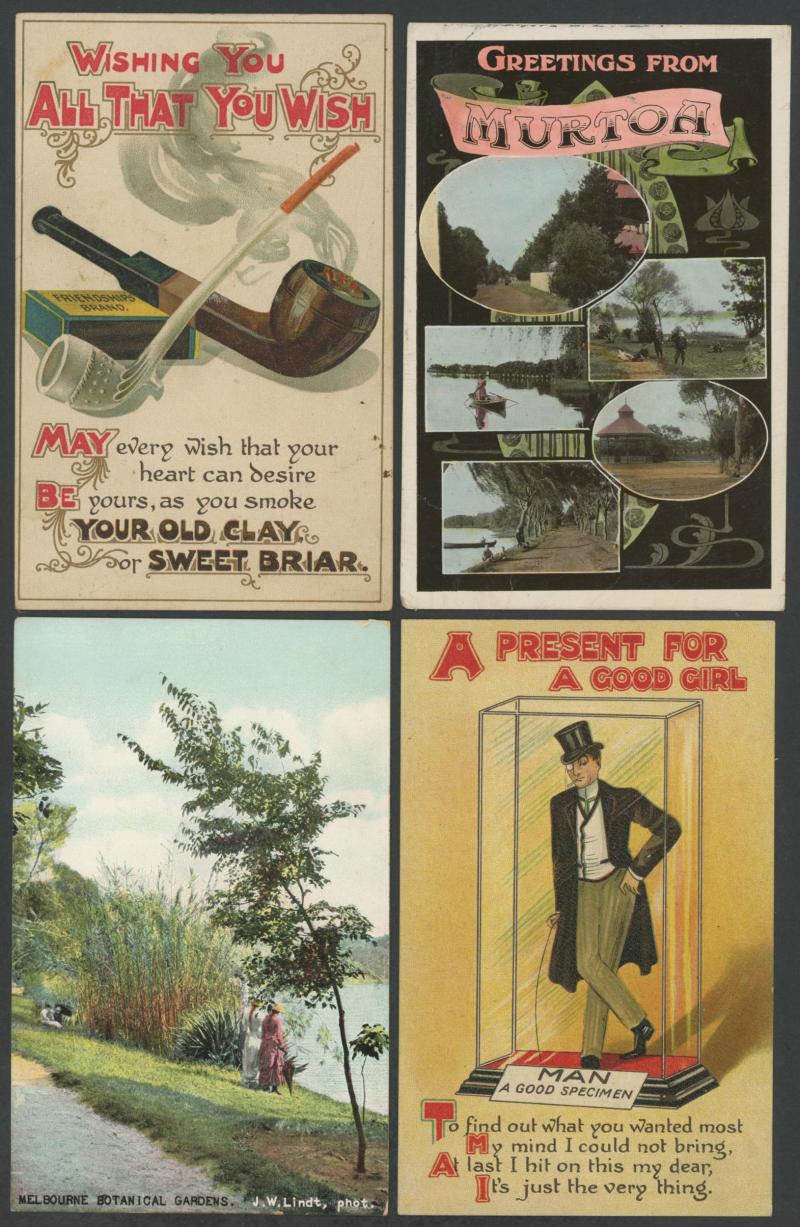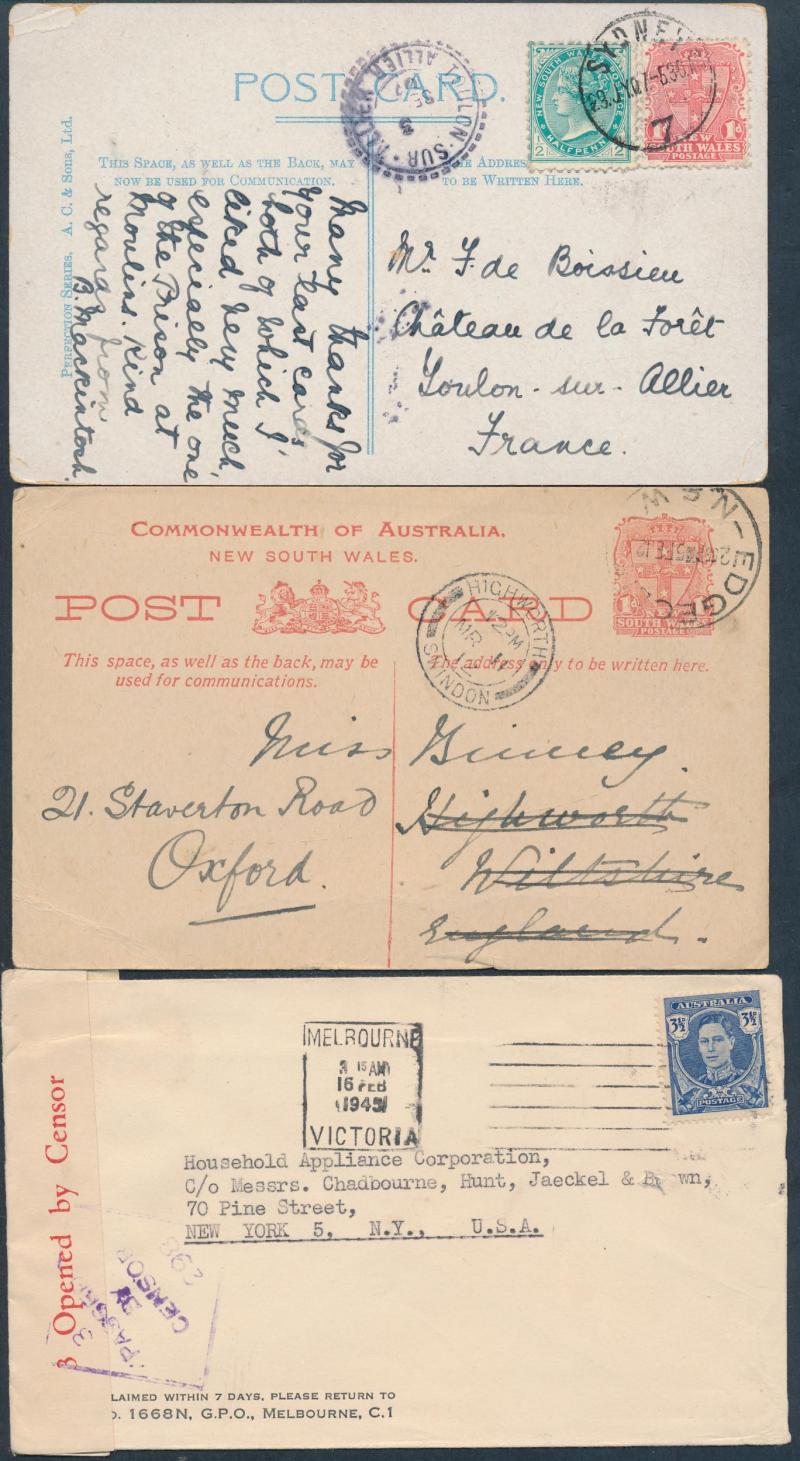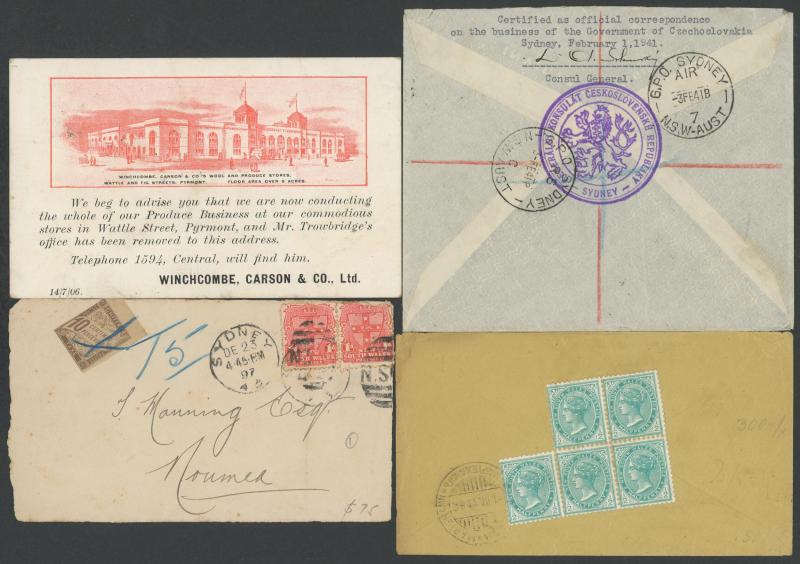 Eclectic lot including 1897 NSW front to New Caledonia with 10c Postage Due, 1906 illustrated advertising PPC for Winchcombe Carson