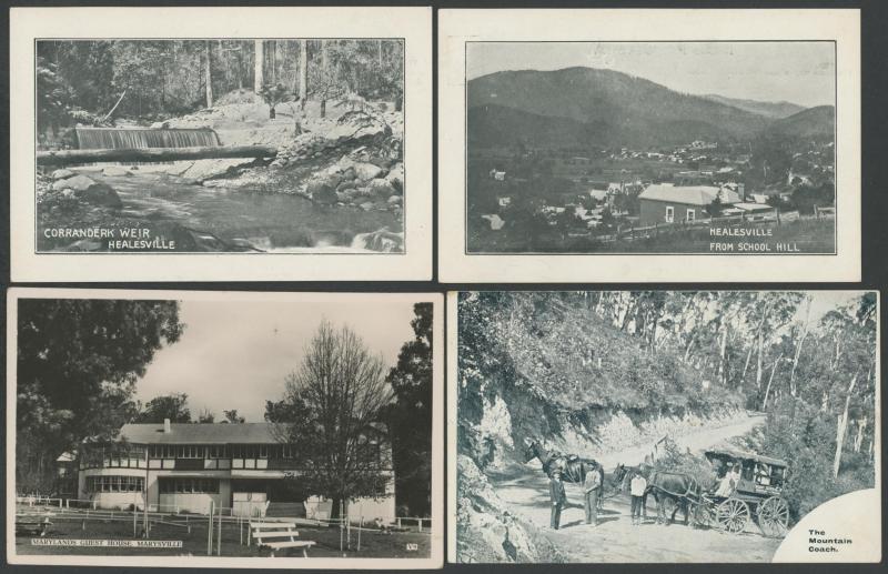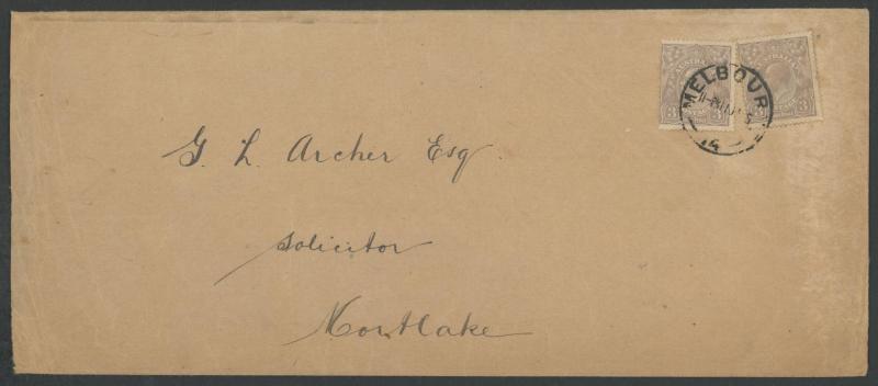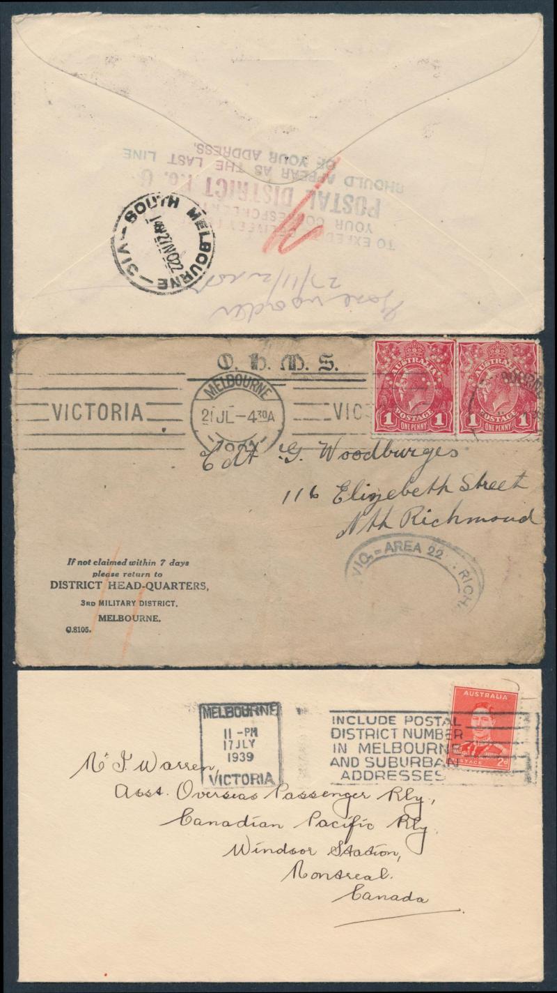 usage of 1850s type), '.../KEW'. ', faint '.../KOYUGA' (the message in shorthand), '.../MENTONE' ,'.../MITCHAM', '.../OLINDA' & straight-line 'Missent to Selby' on the same cover, '.../PORT MELBOURNE', '.../RICHMOND' and '.../WANGARATTA', also 1939