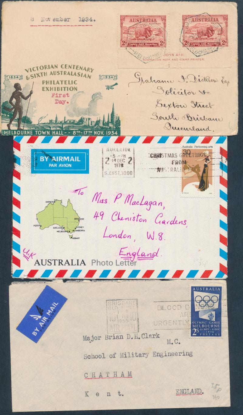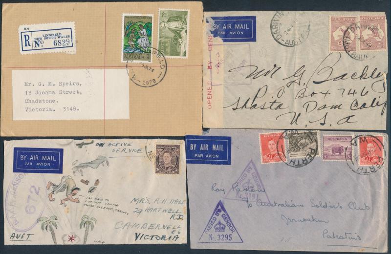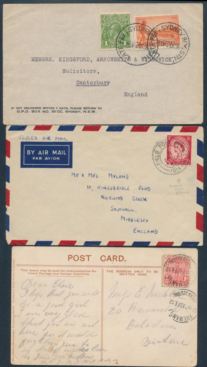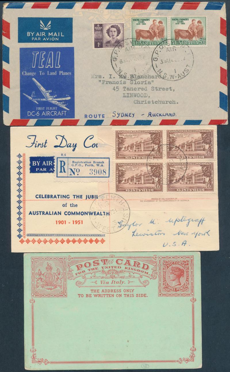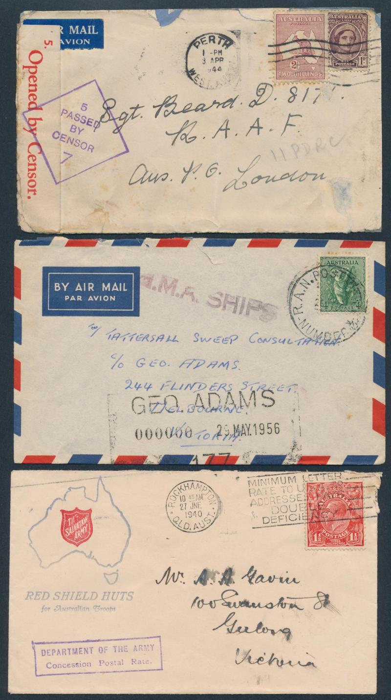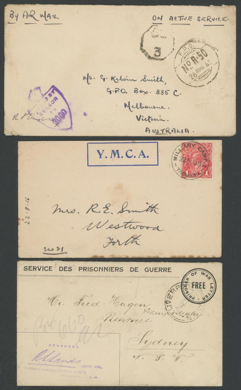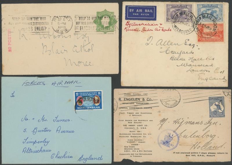 to England and 1915 cover with printed-boxed 'YMCA' & 1d red tied by 'MILITARY CAMP 1/TASMANIA' cds, Malayan Emergency covers to Australia x4 (one registered), 1930s commercial airmails & flights including inwards items, other covers from UK & USA